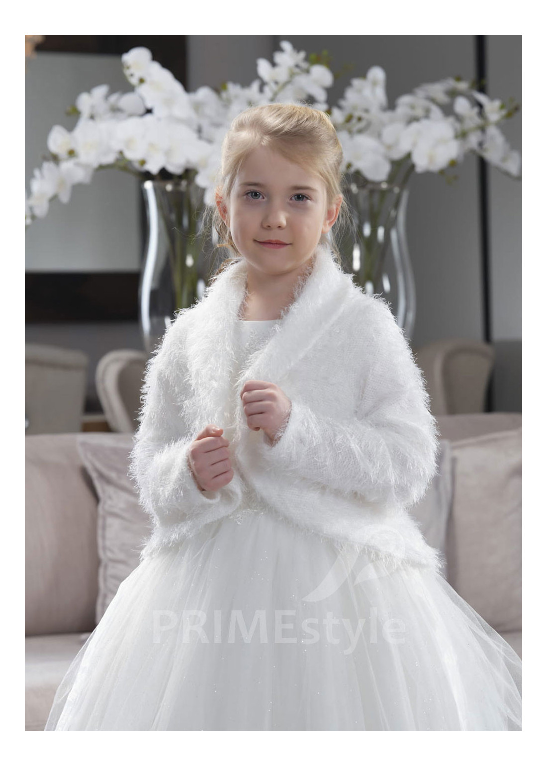 Detský kabátik z umelej kožušiny s dlhým rukávom. Vhodný k šatám na prvé sväté prijímanie aj na iné slávnostné príležitosti.