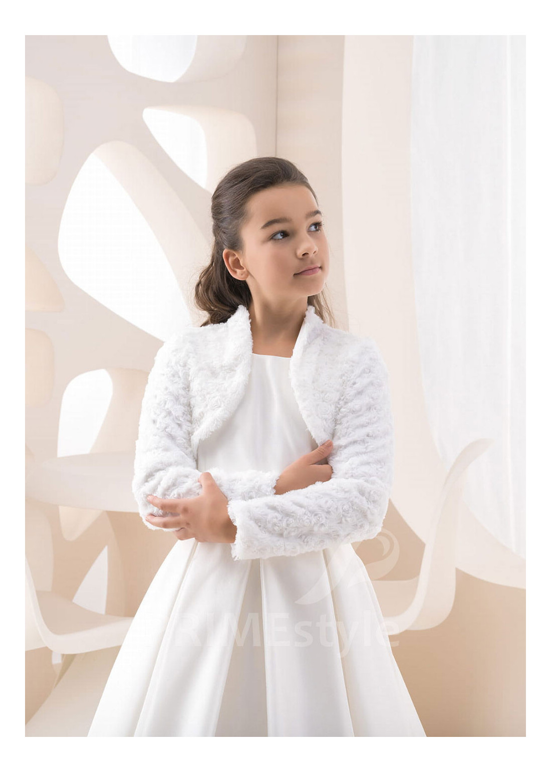 Detský kabátik z umelej kožušiny s dlhým rukávom. Vhodný k šatám na prvé sväté prijímanie aj na iné slávnostné príležitosti.