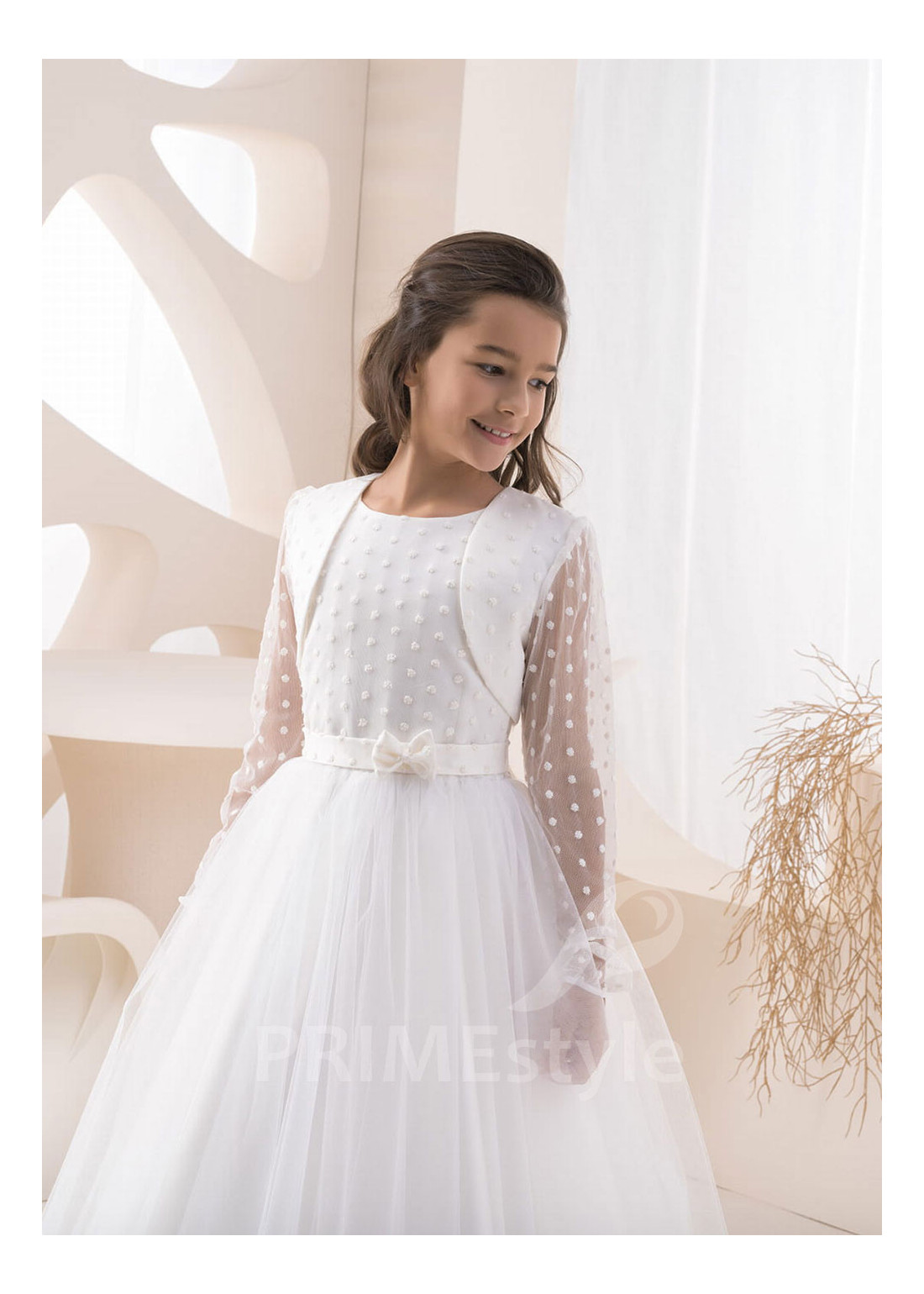 Saténové detské bolerko s dlhým tylovým rukávom. Vhodné k šatám na prvé sväté prijímanie aj na iné slávnostné príležitosti.