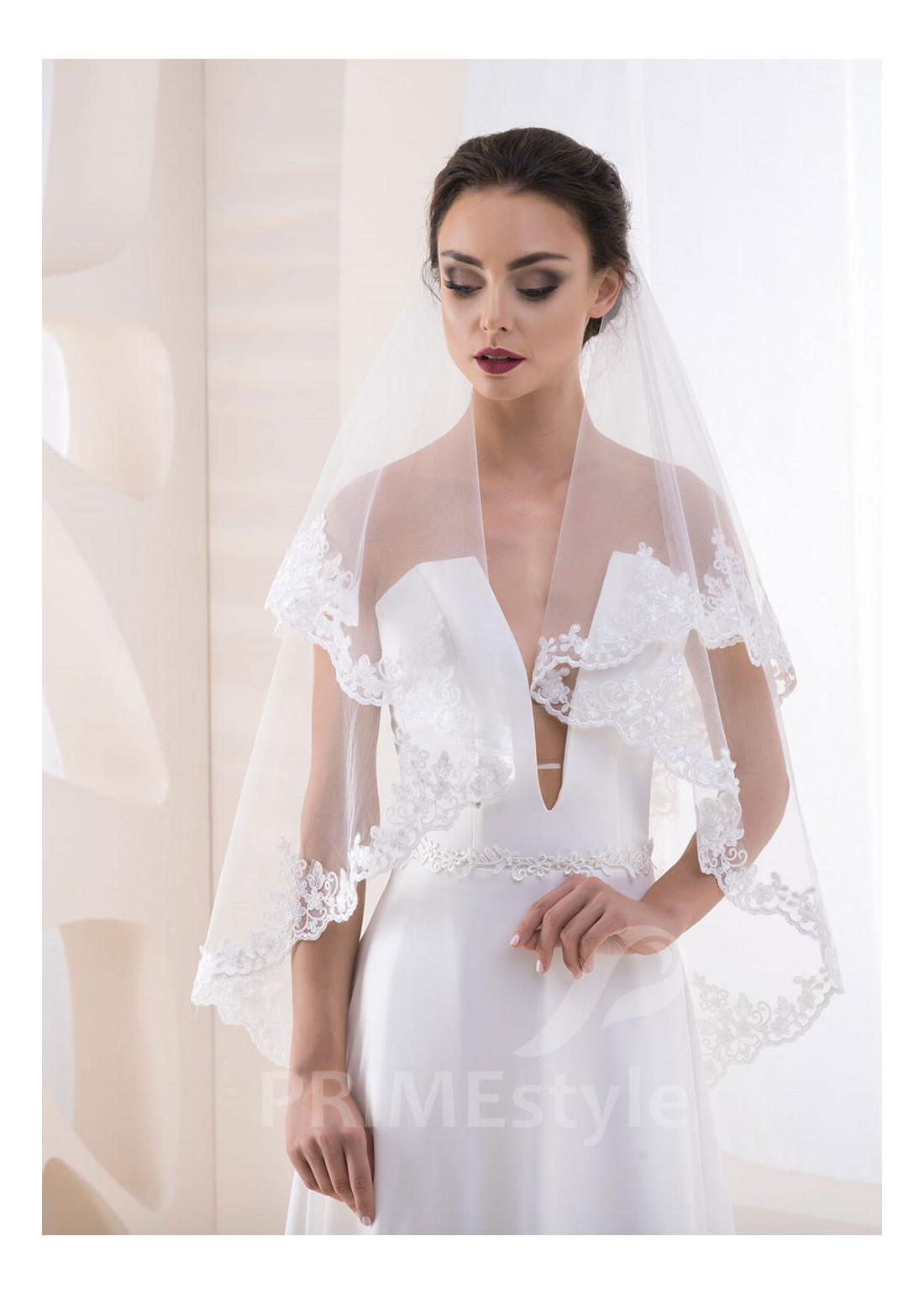 Krátky jednovrstvový svadobný závoj, zdobený čipkou. Šírka 140 cm, dĺžka 70/80 cm.