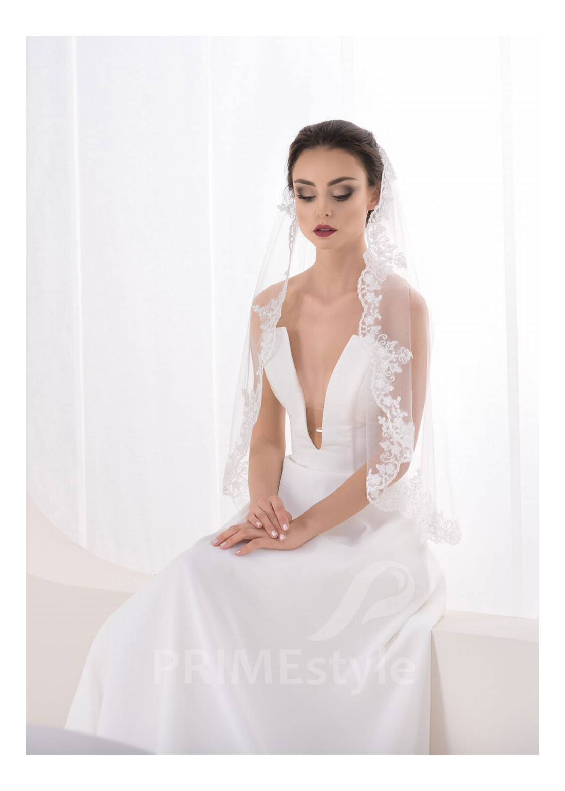 Krátky jednovrstvový svadobný závoj, zdobený efektnou čipkou.