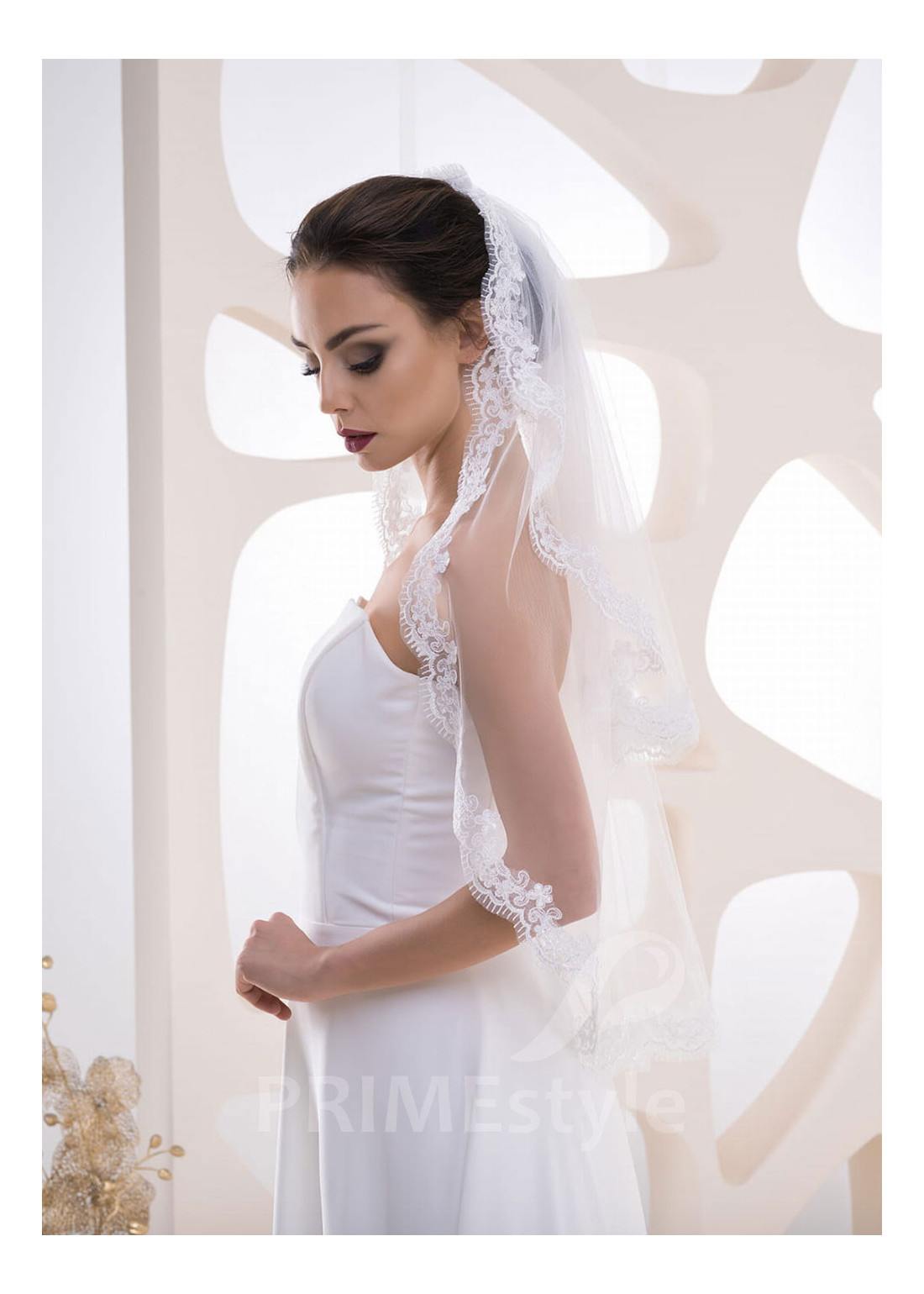 Krátky dvojvrstvový svadobný závoj, zdobený čipkou, zakončený na hrebeni.