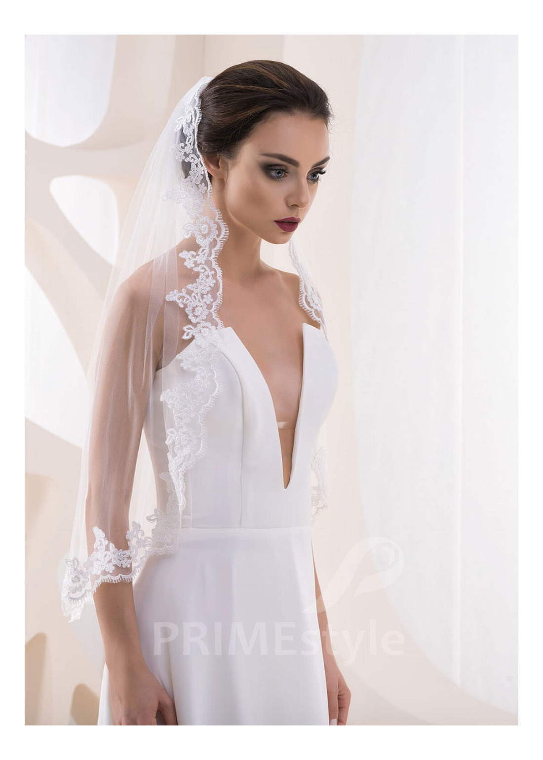 Krátky jednovrstvový tylový svadobný závoj, zdobený čipkou.