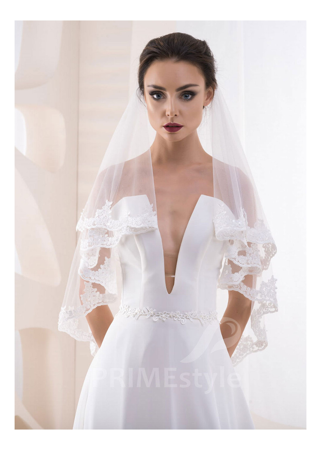 Krátky dvojvrstvový svadobný závoj s okrajom, zdobeným vyšívanou čipkou.