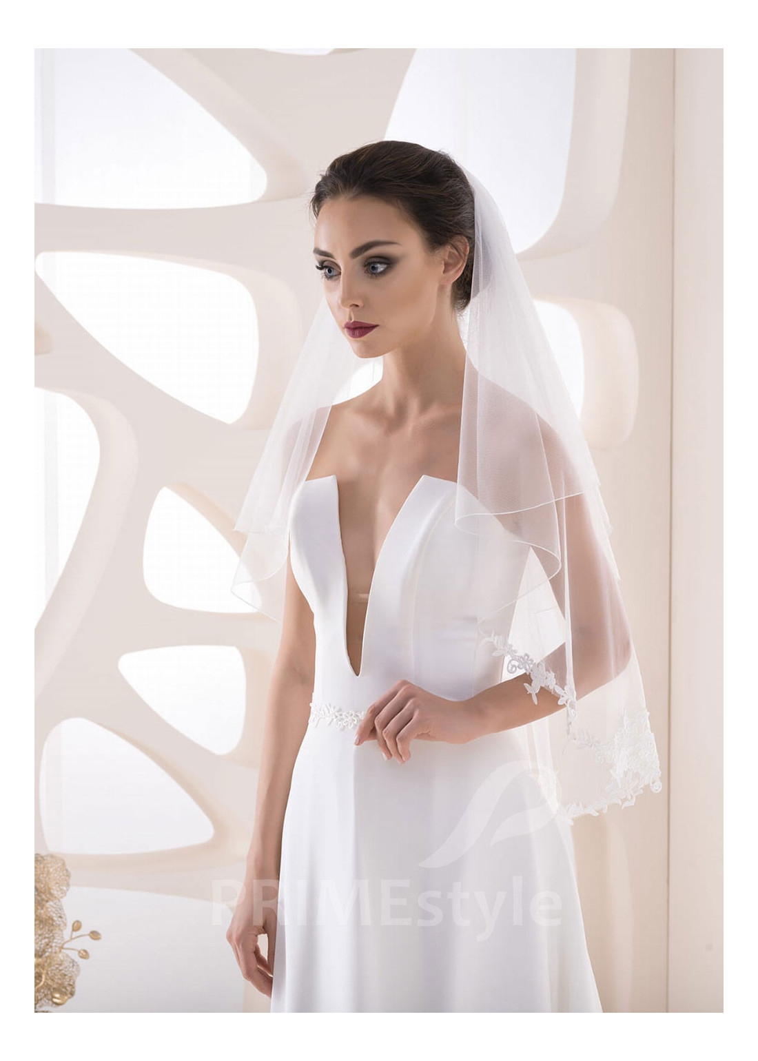 Krátky dvojvrstvový svadobný závoj, jemne zdobený čipkou guipure.