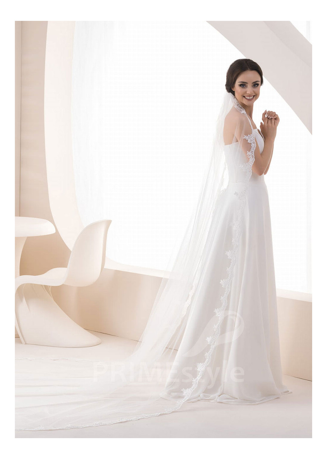 Dlhý dvojvrstvový svadobný závoj s okrajom, zakončeným vyšívanou čipkou.