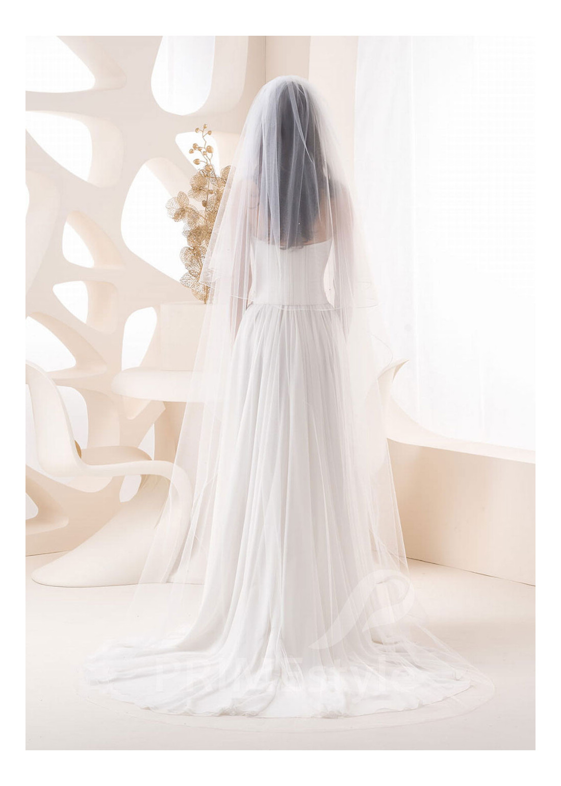 Dlhý dvojvrstvový svadobný závoj z okrajom, zakončeným lemom a zdobený striebornými kamienkami.