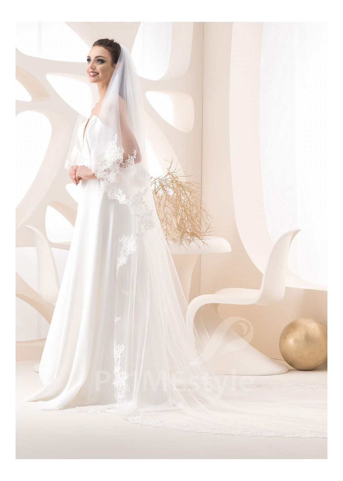 Dlhý dvojvrstvový svadobný závoj s okrajom, zdobený nádhernou čipkou guipure.
