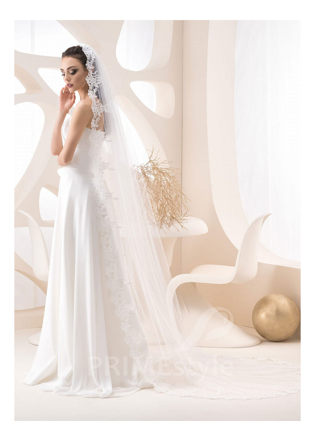 Dlhý jednovrstvový svadobný závoj, zakončený veľkolepou čipkou guipure.
