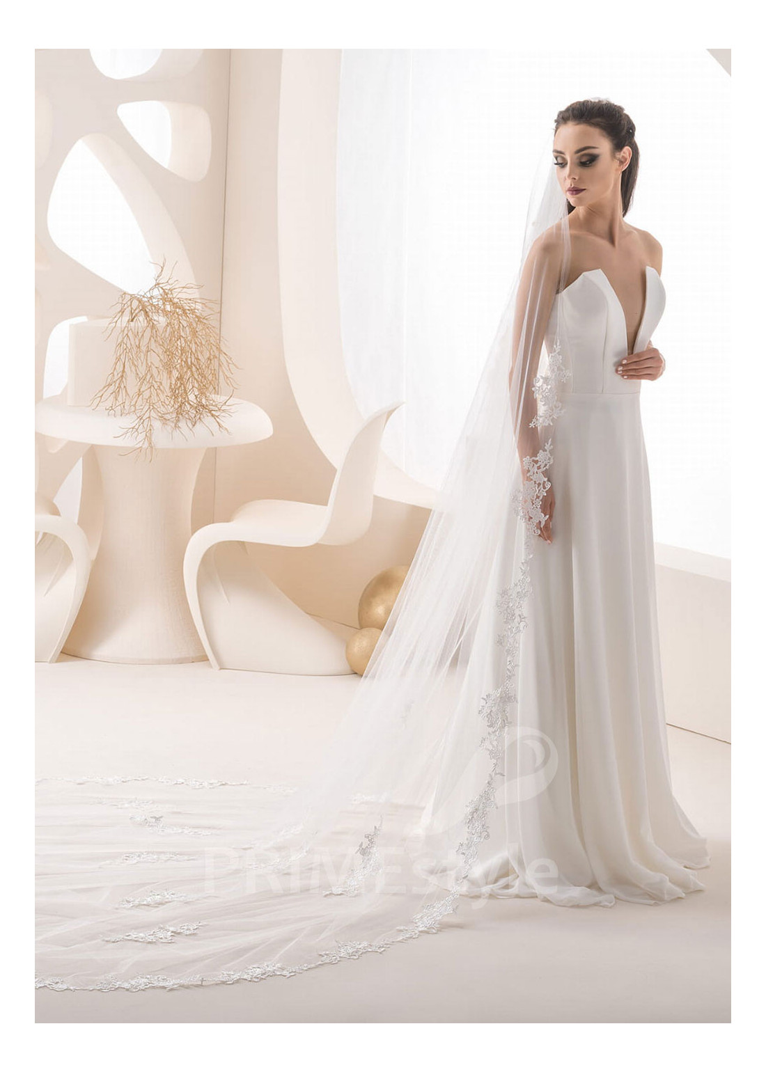 Jednovrstvový svadobný svadobný závoj, bohato zdobený čipkou guipure.
