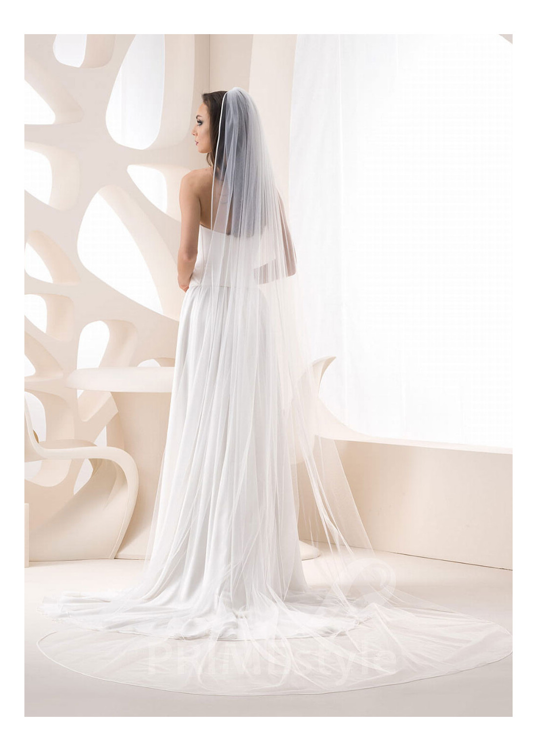 Dlhý jednovrstvový svadobný závoj, zdobený tenkým saténovým pásom.