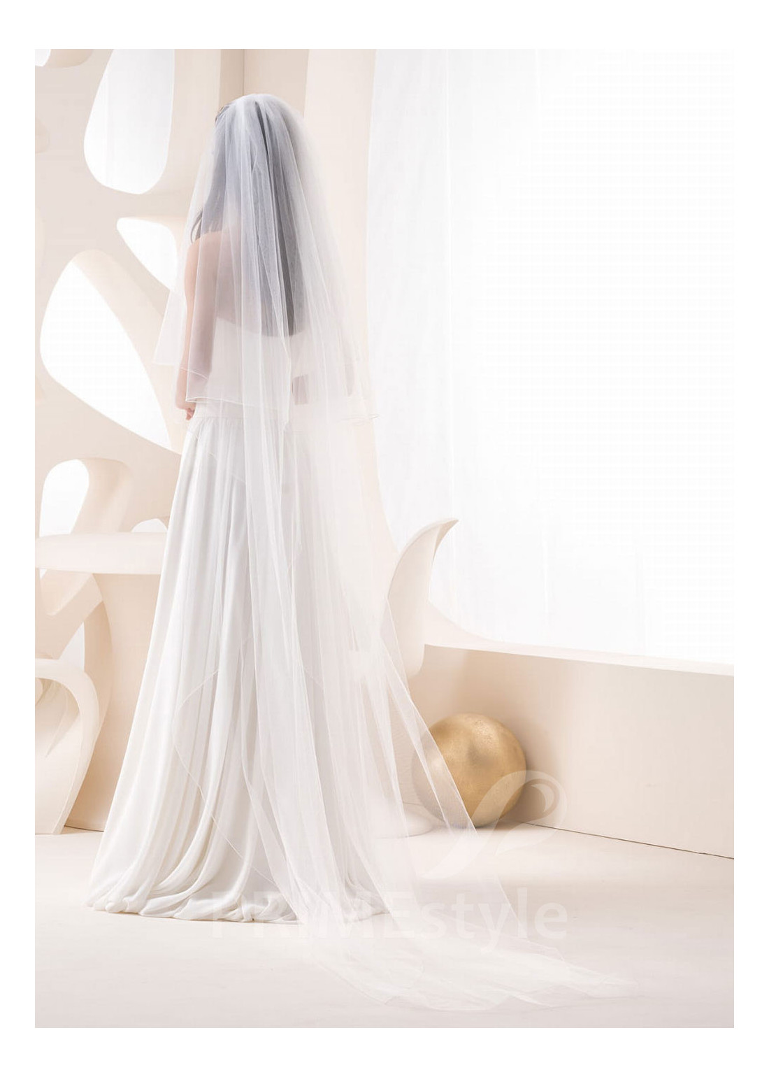 Dlhý dvojvrstvový svadobný závoj s okrajom, zakončeným lemom.