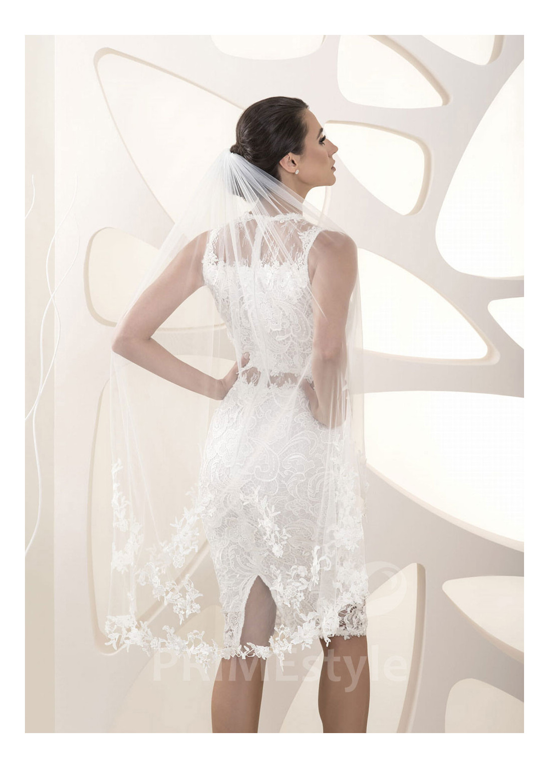 Jednovrstvový svadobný svadobný závoj, bohato zdobený čipkou guipure.