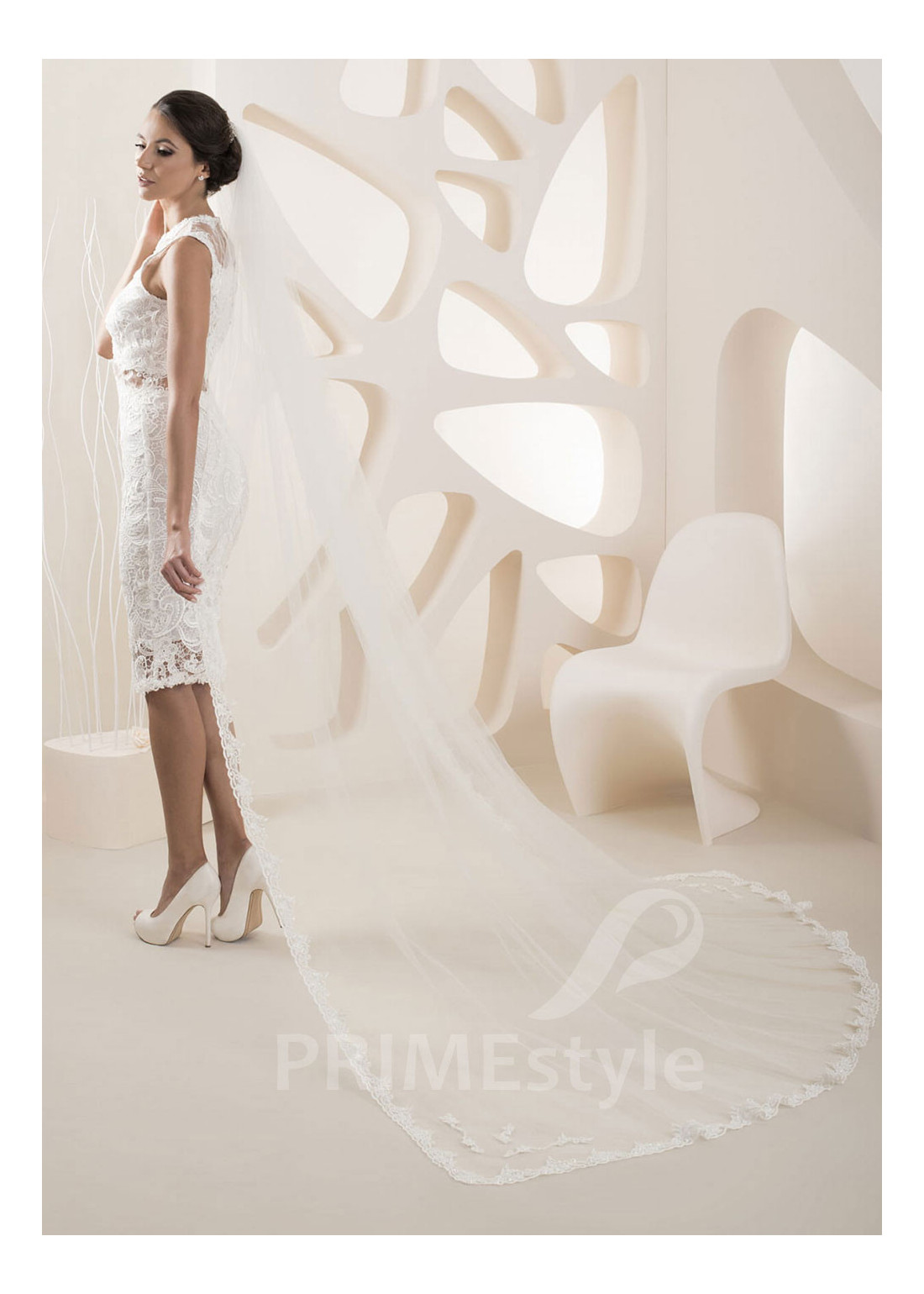 Dlhý dvojvrstvový svadobný závoj s okrajom, zdobeným bohatou čipkou.