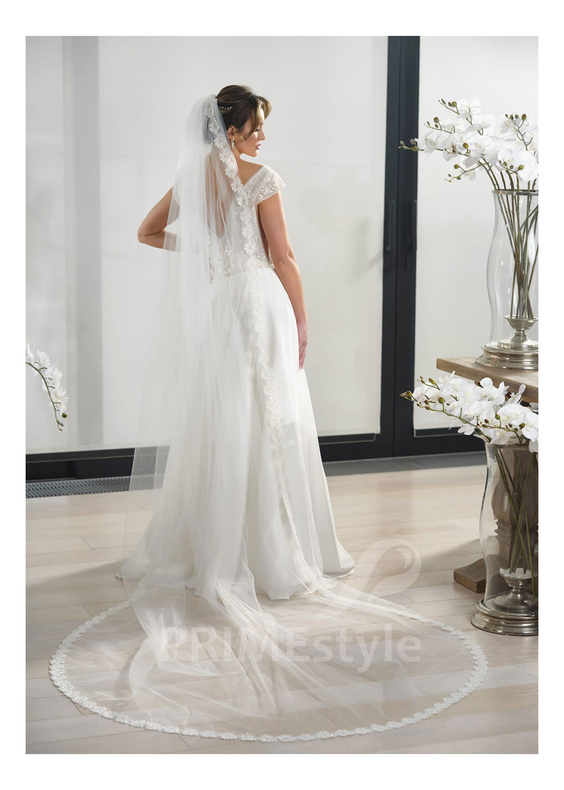 Dlhý jednovrstvový svadobný závoj, zakončený veľkolepou čipkou guipure.