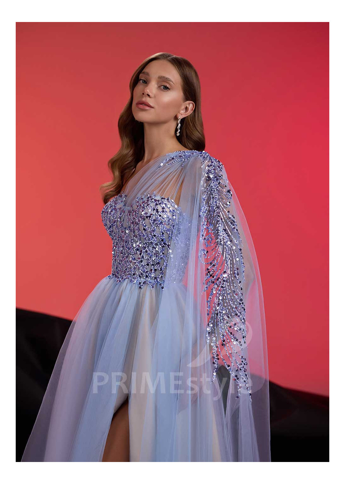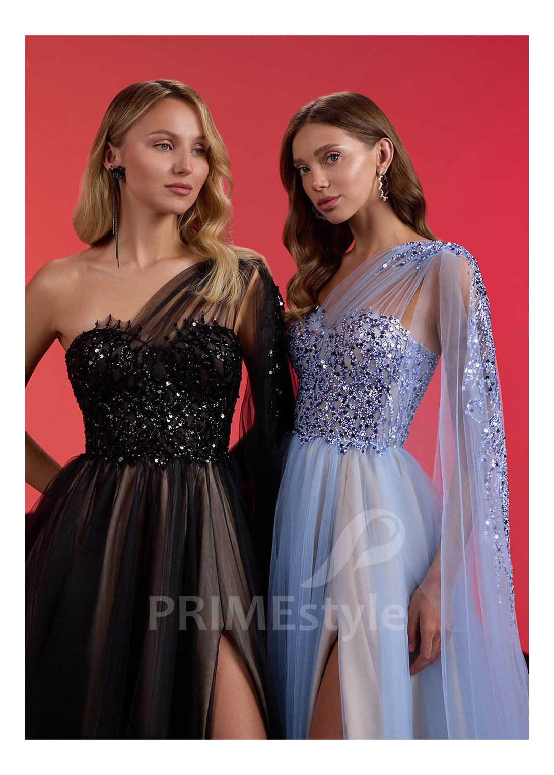 Orignálne tylové spoločenské šaty s dlhým prehozovým rukávom, otvoreným dekoltom, trendovým srdiečkovým výstrihom na hrudi, mierne odhaleným chrbtom a ľahkou pradavou tylovou sukňou s rozparkom. Korzet a rukáv sú zdobené bohatou vyšívanou čipkou. Vhodné aj ako šaty na ples, dlhé večerné šaty a šaty na stužkovú.