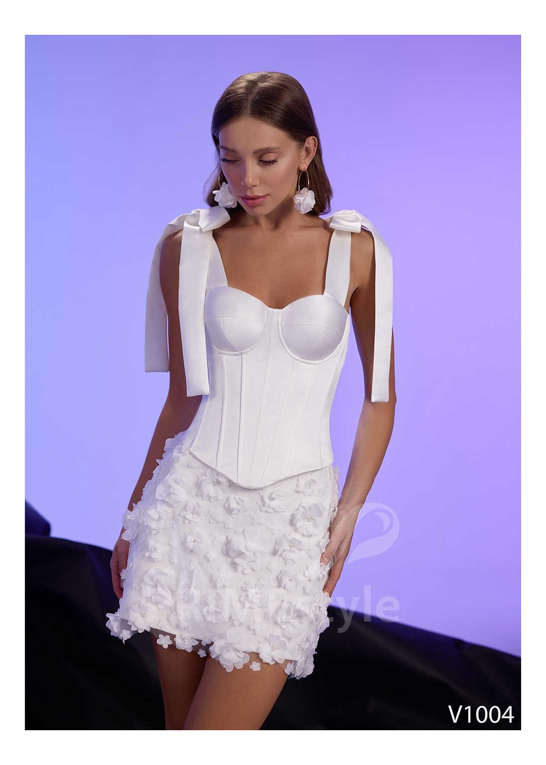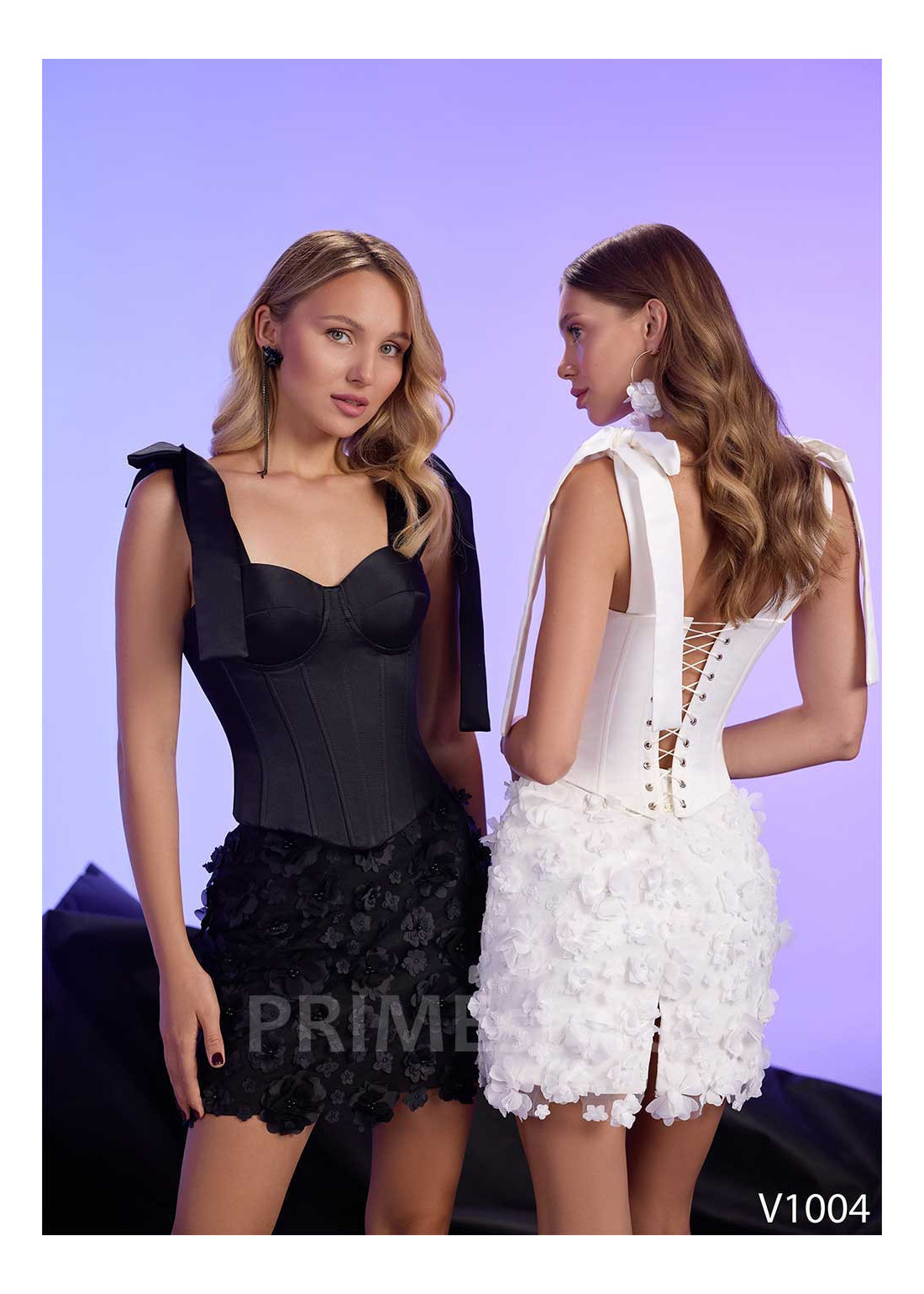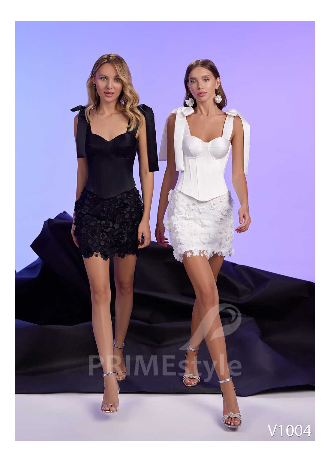 PRIMEstyle®Extravagantné dvojdielne sexi spoločenské šaty na široké ramienka so samostatným korzetom na šnurovačku a efektnou mini sukňou, bohato zdobenou rozkošnou čipkou s 3D kvetmi. Vhodné ako krátke večerné šaty, krátke šaty na svadbu a luxusné párty šaty.