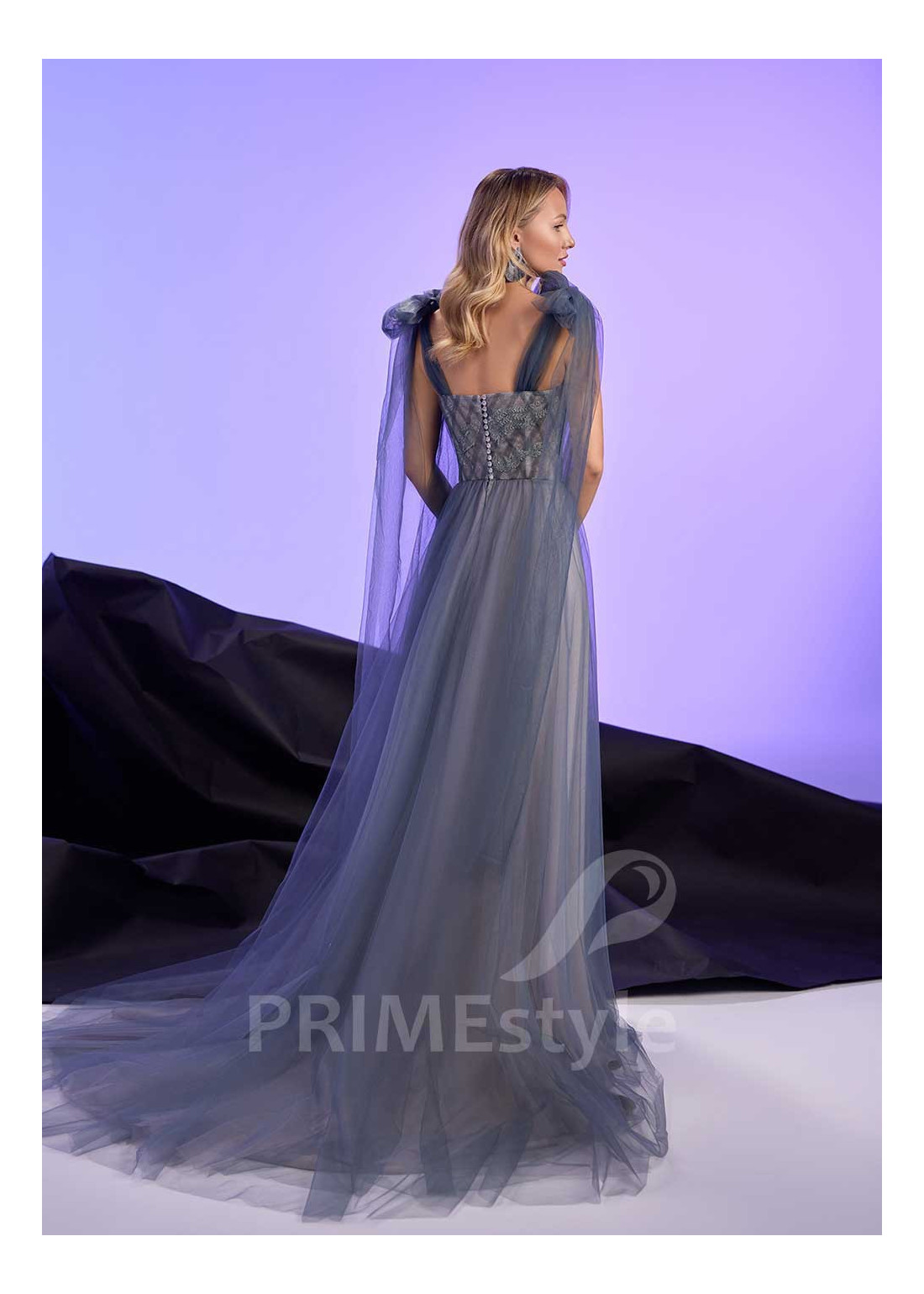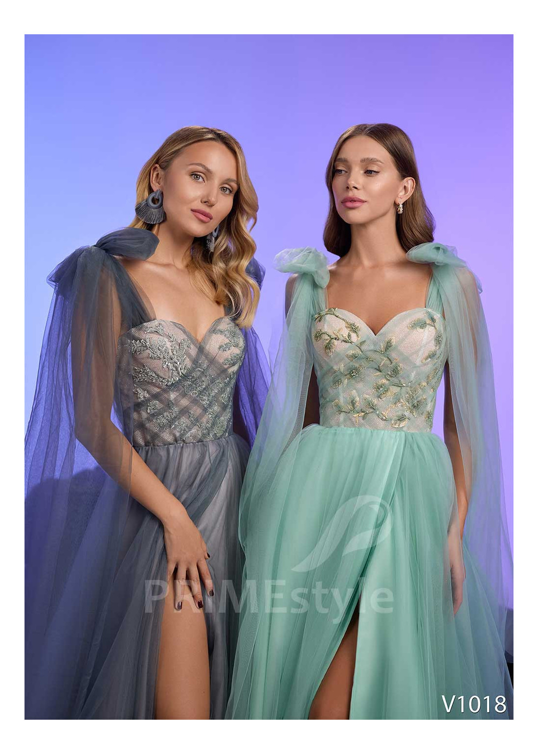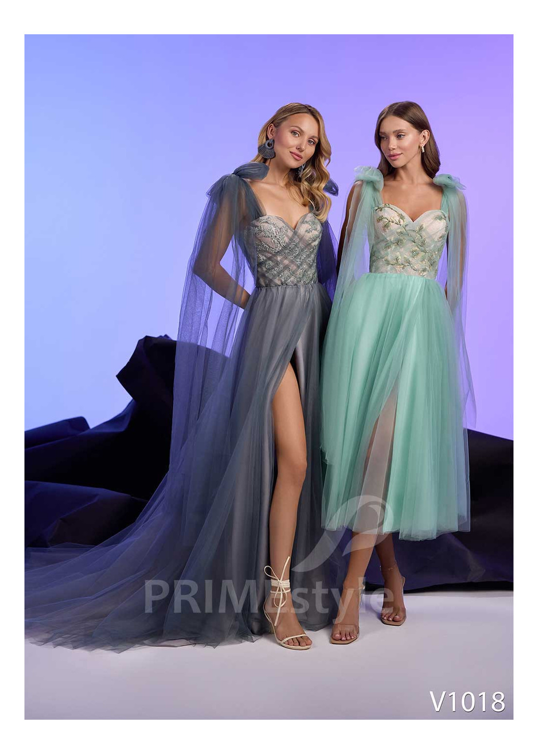 Vkusné čipkované spoločenské šaty s dlhými prehozovými rukávmi, trendovým srdiečkovým výstrihom na hrudi, mierne odhaleným chrbtom a ľahkou padavou tylovou sukňou s rozparkom. Možnosť ušitia s midi alebo maxi sukňou. Vhodné aj ako šaty na ples, dlhé večerné šaty, šaty na stužkovú, popolnočné šaty, šaty na svadbu a šaty pre svadobné mamy.