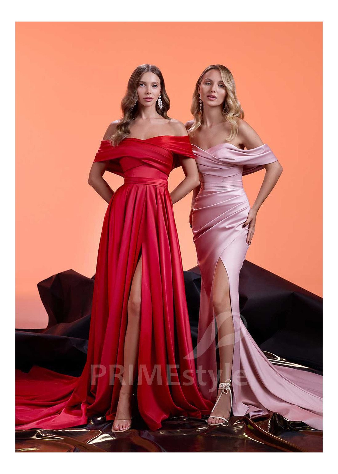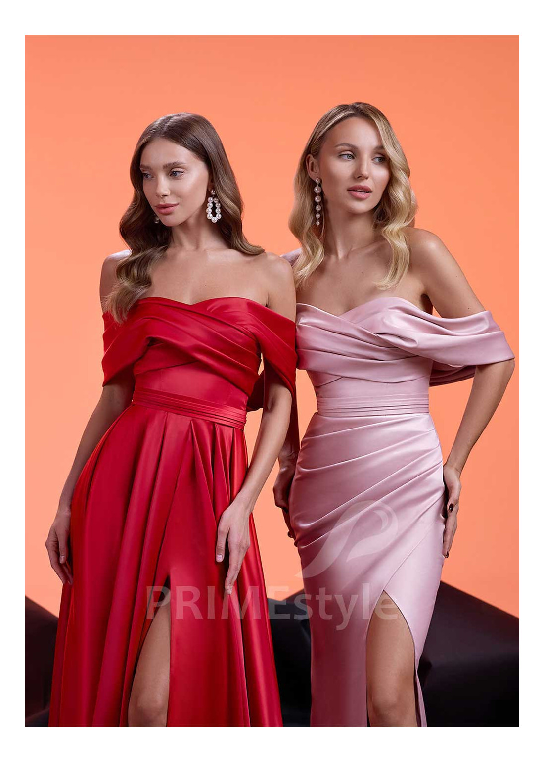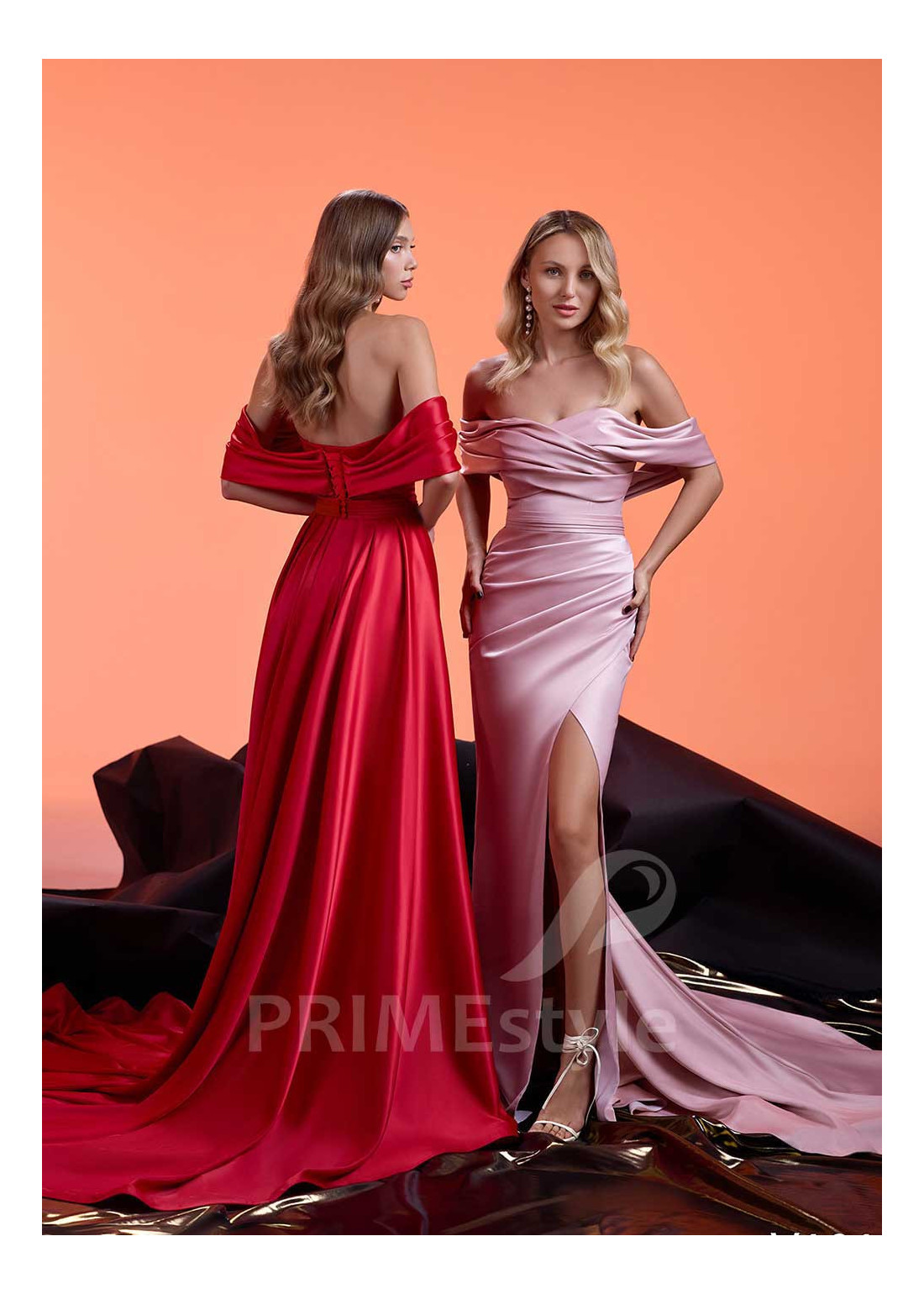 Elegantné saténové spoločenské šaty s padnutými ramienkami, otvoreným dekoltom, výstrihom v tvare V, odhalenými ramenami a chrbtom a pekne tvarovanou padavou sukňou. Možnosť výberu strihu sukne z dvoch variant. Vhodné aj ako dlhé večerné šaty, šaty na stužkovú, popolnočné šaty, šaty na svadbu a šaty pre svadobné mamy.