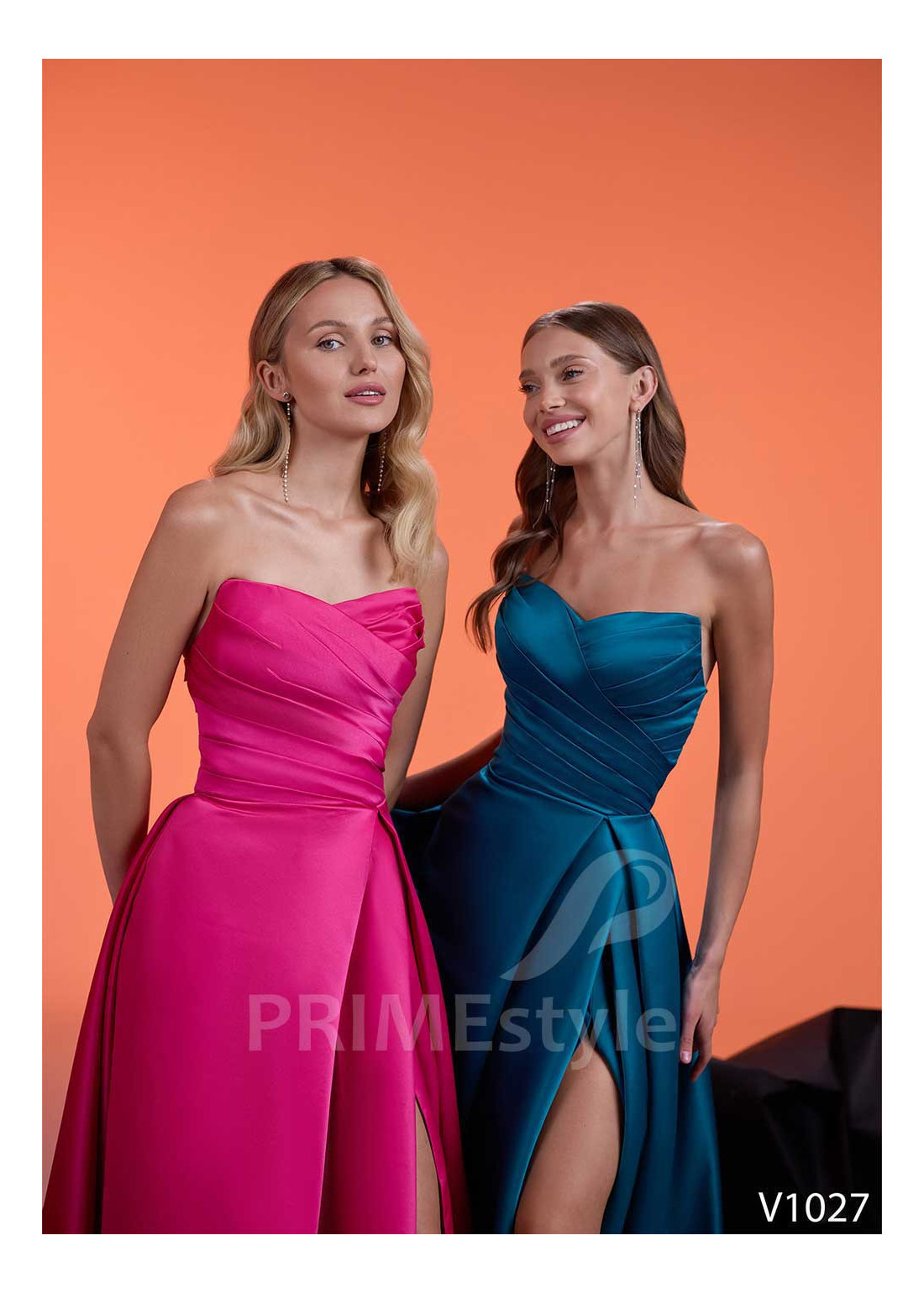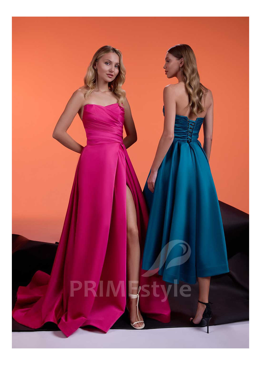 Elegantné spoločenské šaty s otvoreným dekoltom, odhalenými ramenami a chrbtom, výstrihom v tvare V a padavou saténovou sukňou s rozparkom. Možnosť ušitia s midi alebo maxi sukňou. Vhodné aj ako šaty na ples, večerné šaty, šaty na stužkovú, popolnočné šaty a šaty pre svadobné mamy.