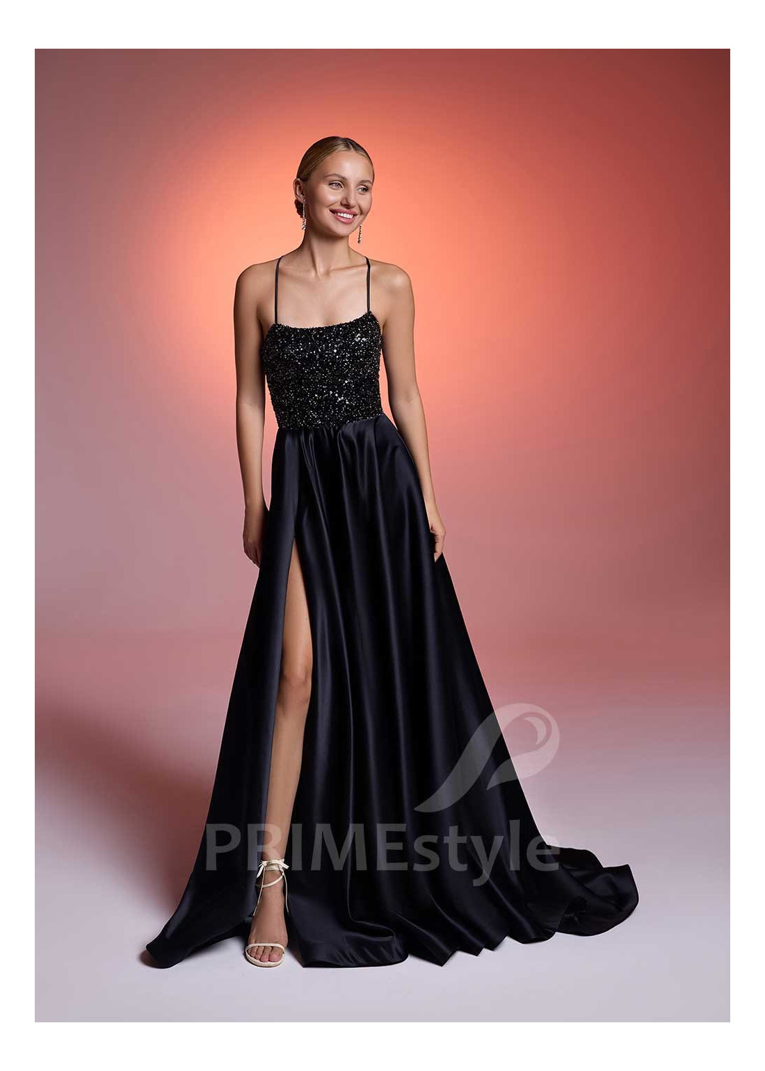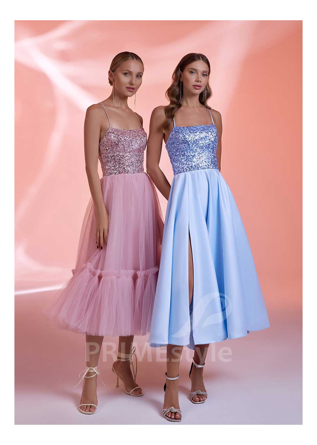 PRIMEstyle®Slávnostné spoločenské šaty na tenké ramienka s otvoreným dekoltom, trendovým rovným výstrihom na hrudi, odhaleným chrbtom a pekne tvarovanou padavou midi sukňou. Možnosť výberu typu a strihu sukne z dvoch variant. Vhodné ako midi šaty na ples, luxusné šaty na svadbu, šaty na promócie a šaty pre svadobnú mamu.