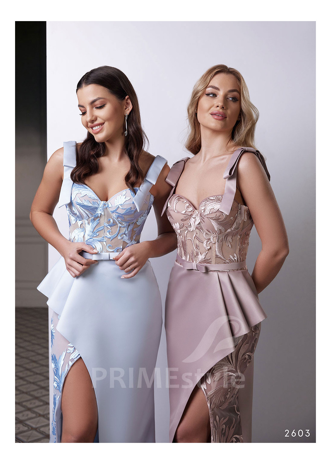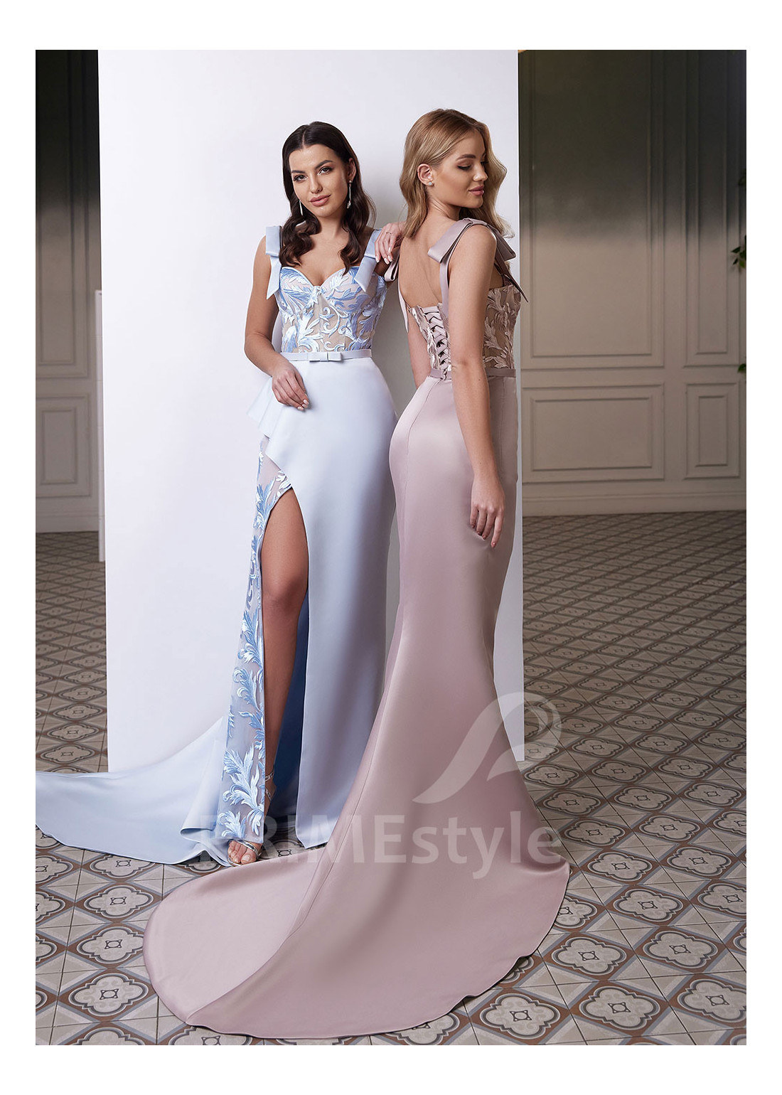 PRIMEstyle®Priliehavé moderné spoločenské šaty na ramienka, zdobené luxusnou čipkou. S efektnou asymetrickou saténovou sukňou a s rozparkom na pravej nohe.