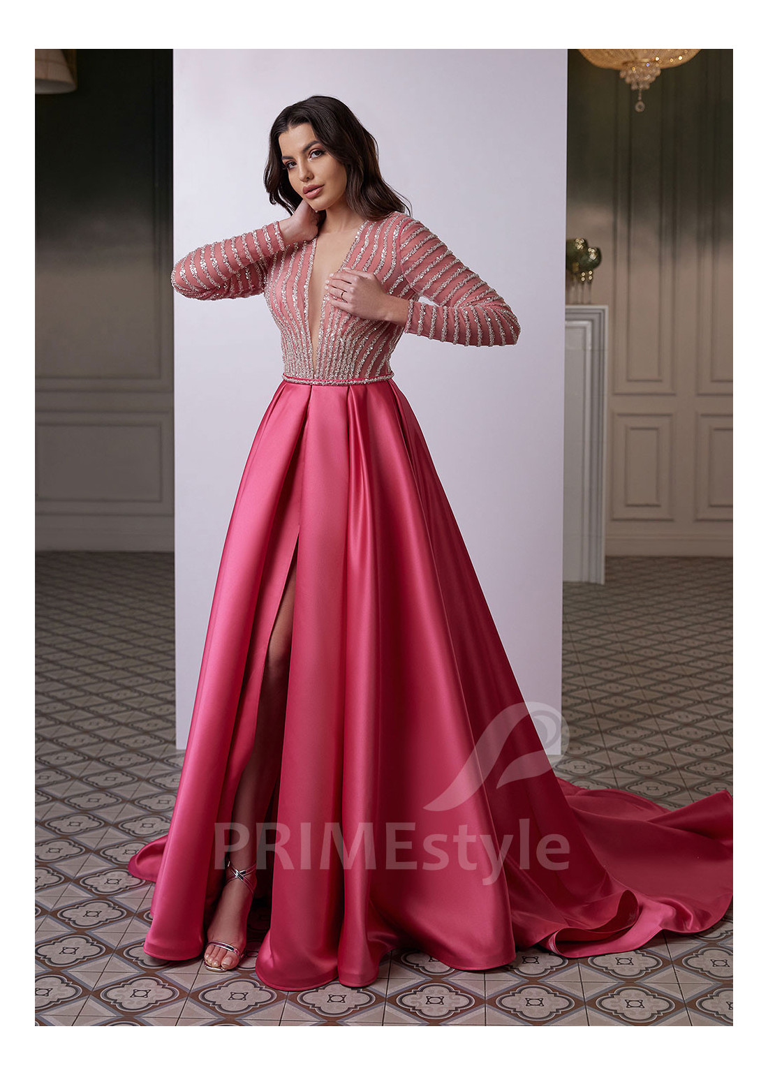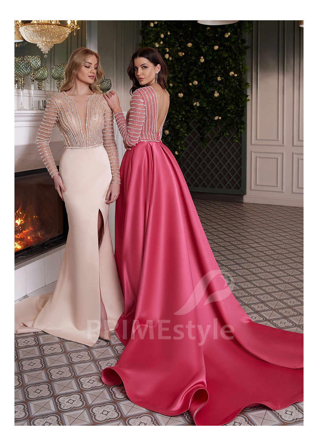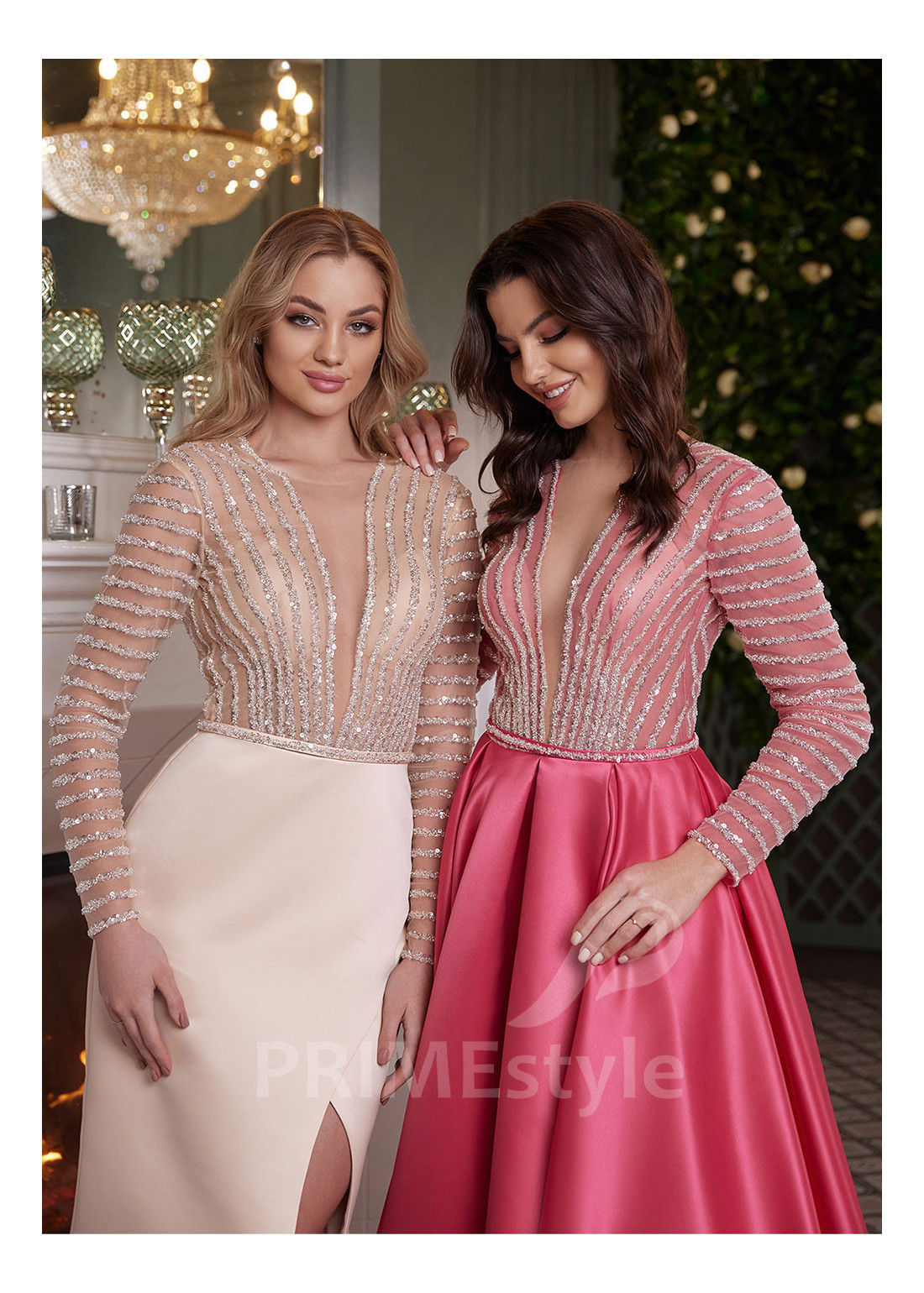 Elegantné spoločenské šaty s dlhým rukávom, hlbokým V-výstrihom a bohato zdobeným trblietavým korzetom. Možnosť výberu strihu sukne z dvoch variant. Vhodné aj ako šaty pre svadobné mamy.