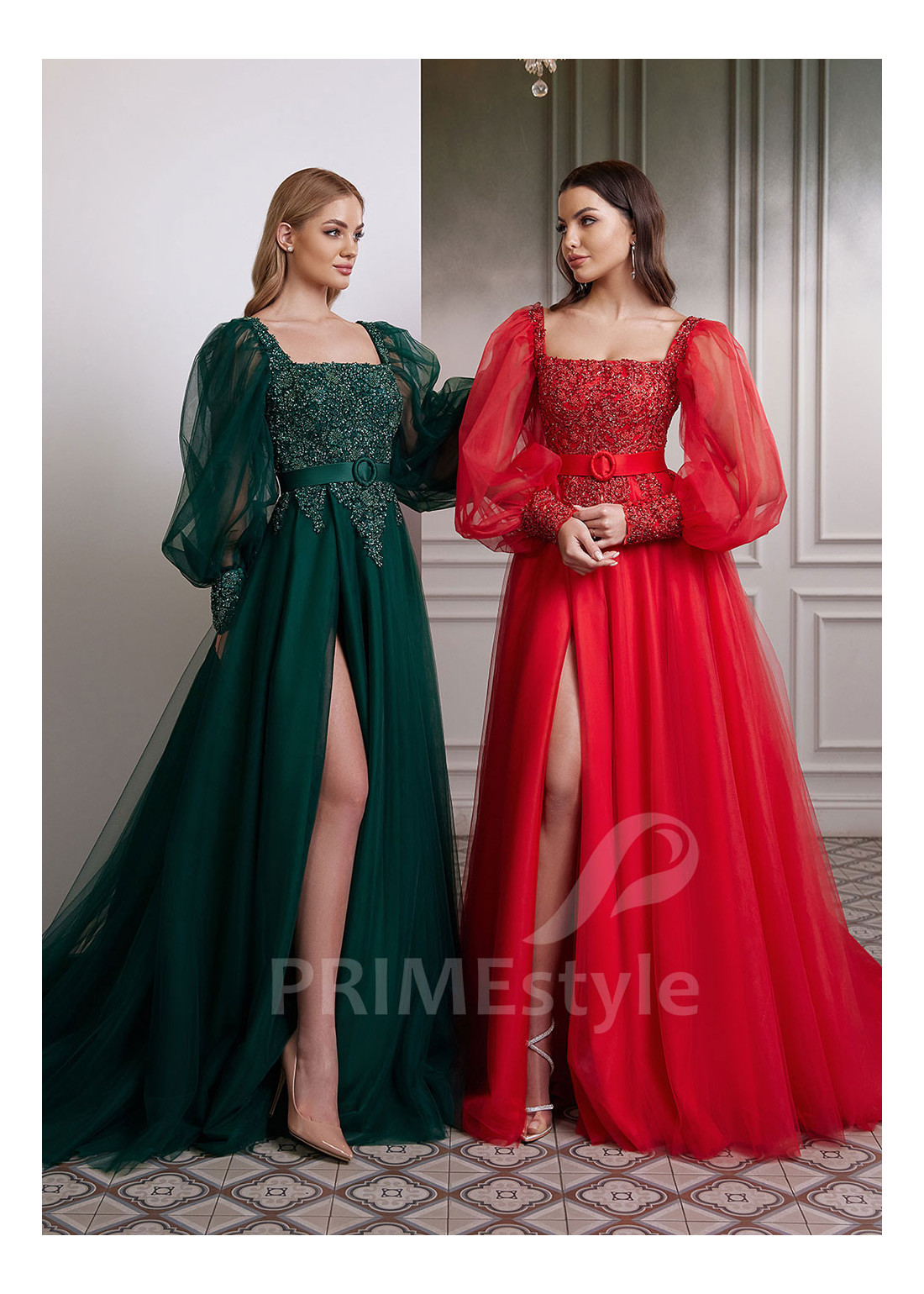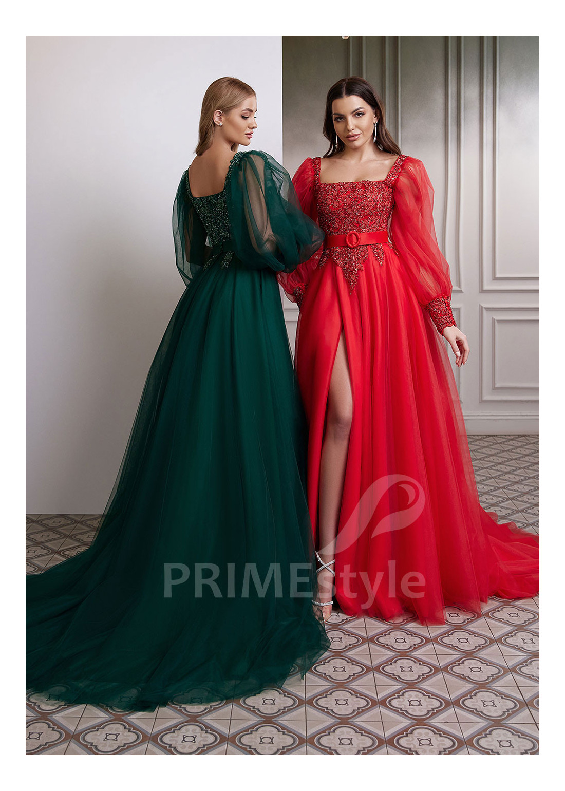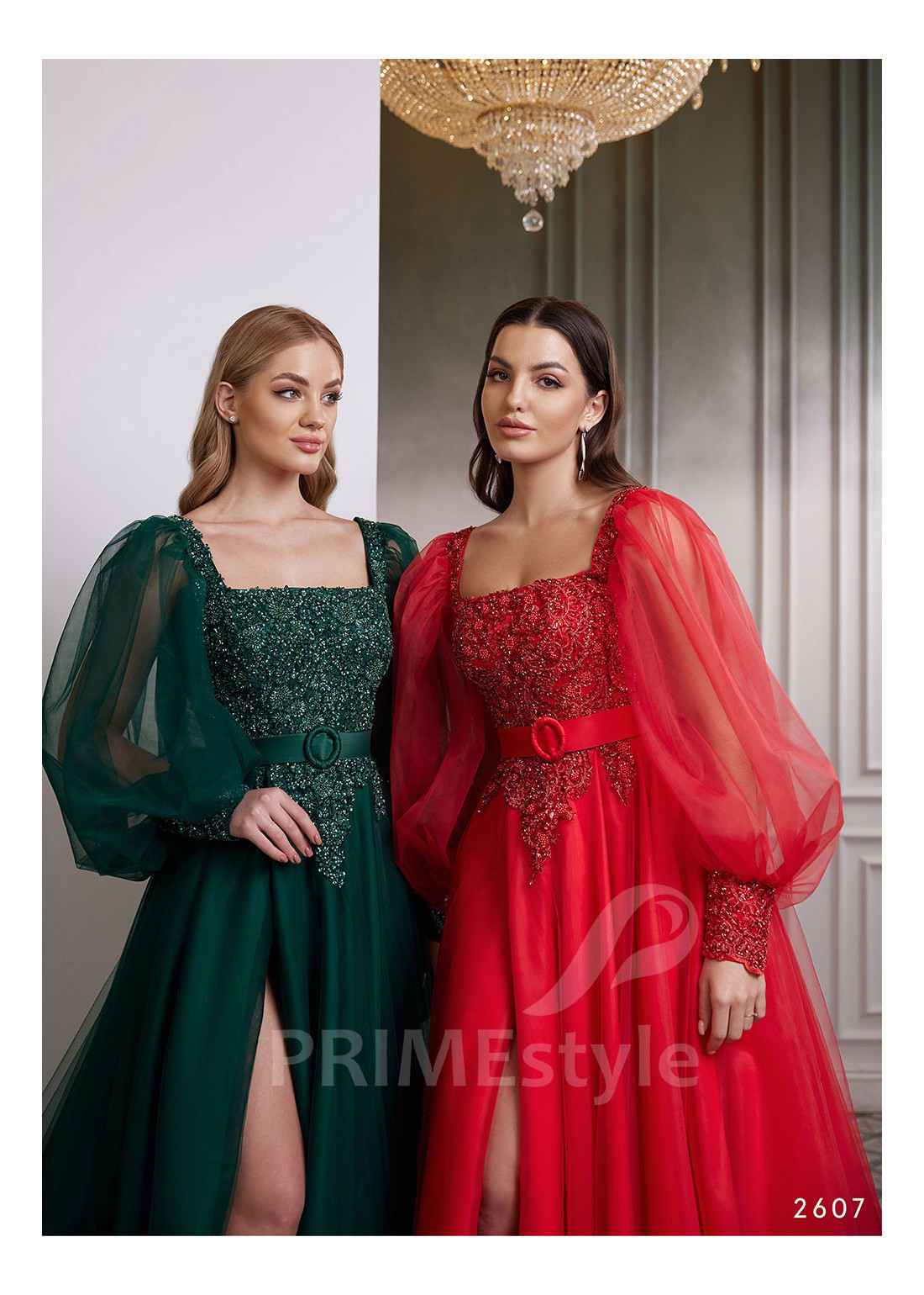 Exkluzívne spoločenské šaty s trendovým štvorcovým výstrihom na hrudi, balónovými rukávmi, bohato zdobeným korzetom a s ľahkou tylovou sukňou s rázporkom. Vhodné aj ako šaty pre svadobné mamy.