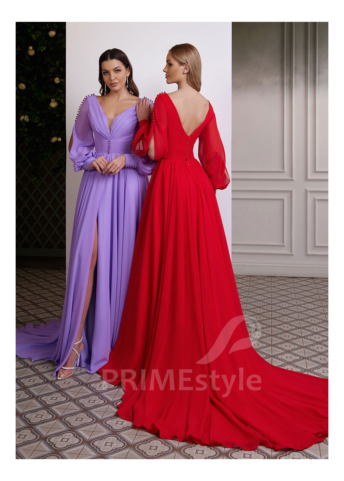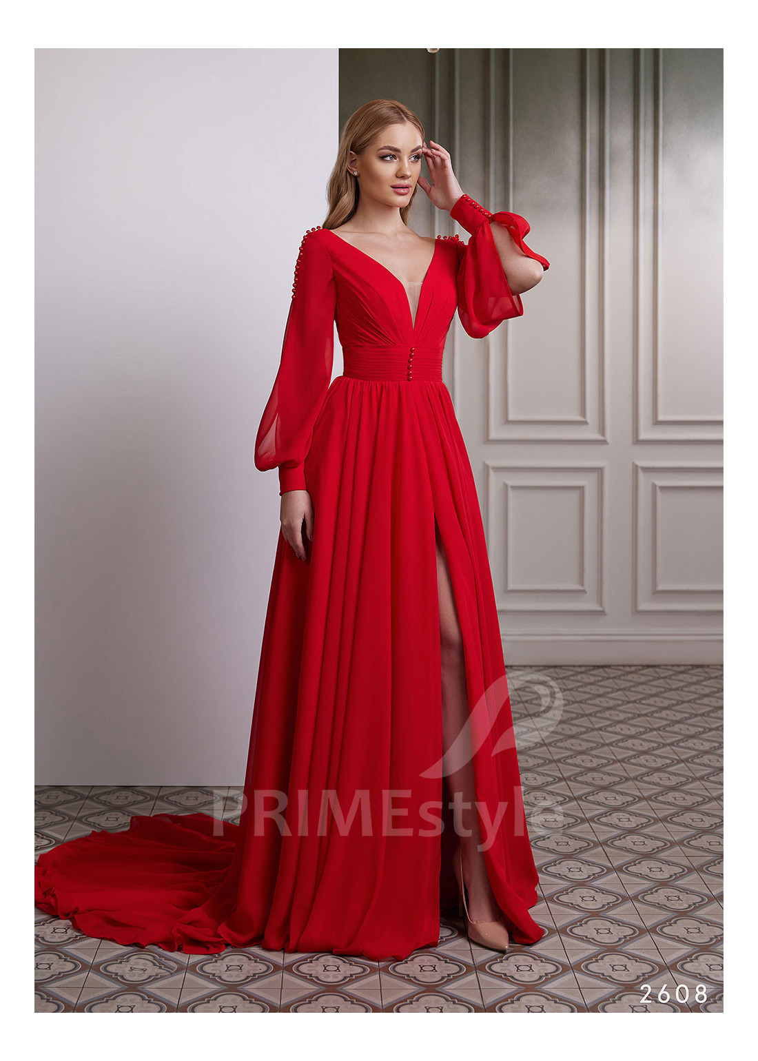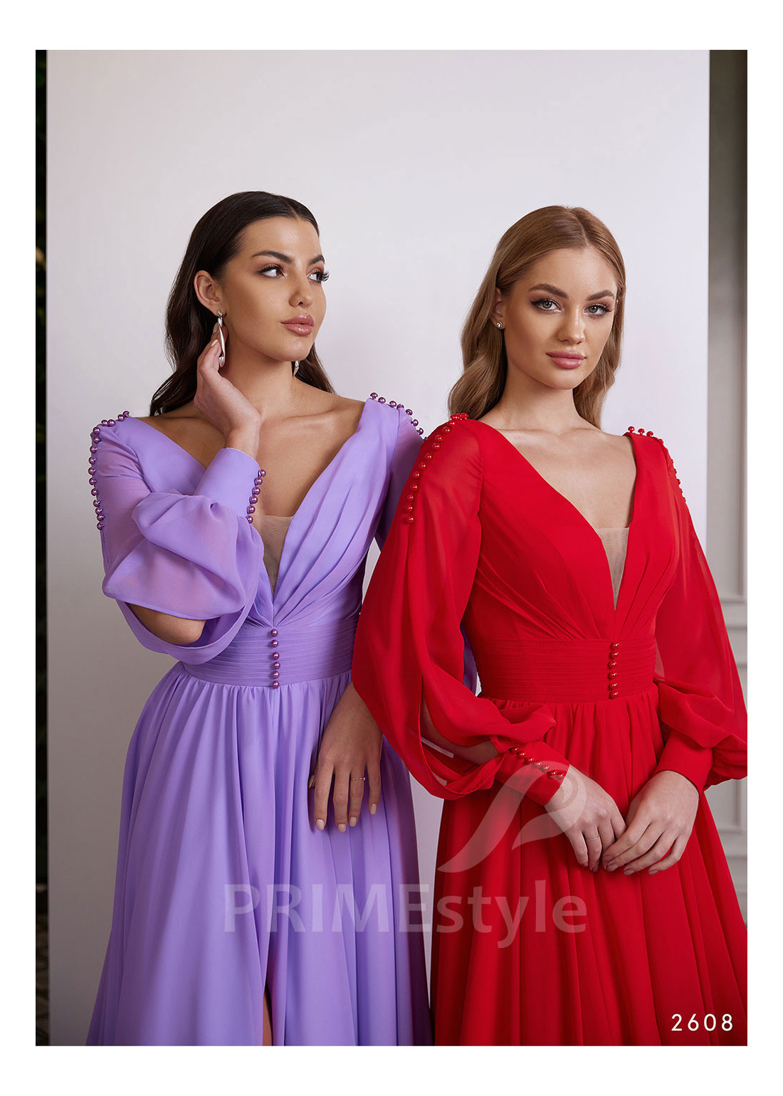 Decentné šifónové spoločenské šaty s dlhým rukávom, zdobené korálkami. Mimoriadne vydarený strih, ktorý pekne tvaruje postavu. Vhodné ako šaty pre družičky aj ako šaty pre svadobné mamy.