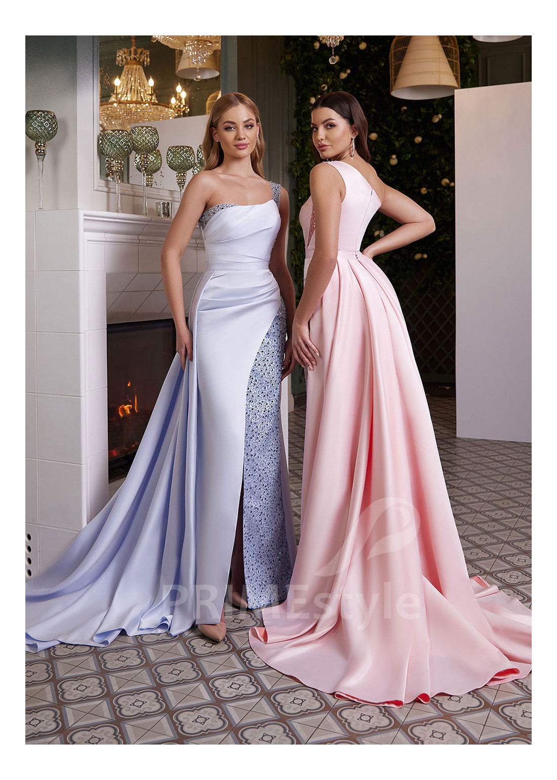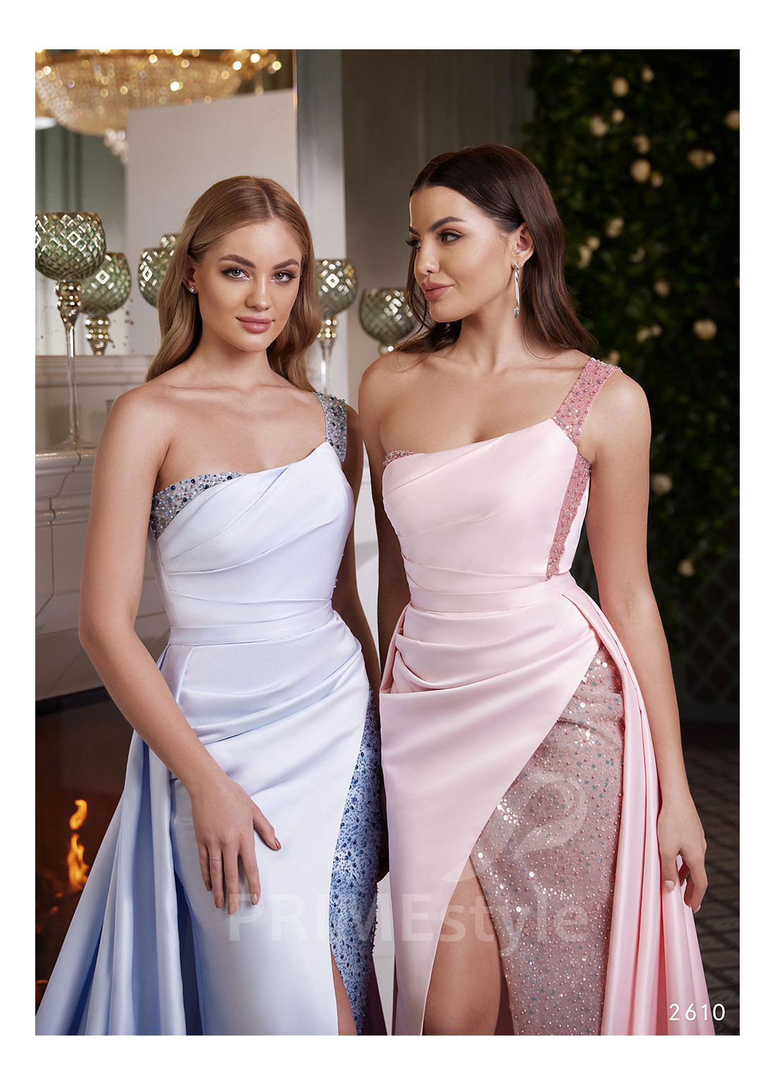 Asymetrické spoločenské šaty so saténovou sukňou, bohato zdobené perličkami a trblietkami, zapínanie je na zips. Vhodné ako popolnočné šaty alebo družičkovské šaty.