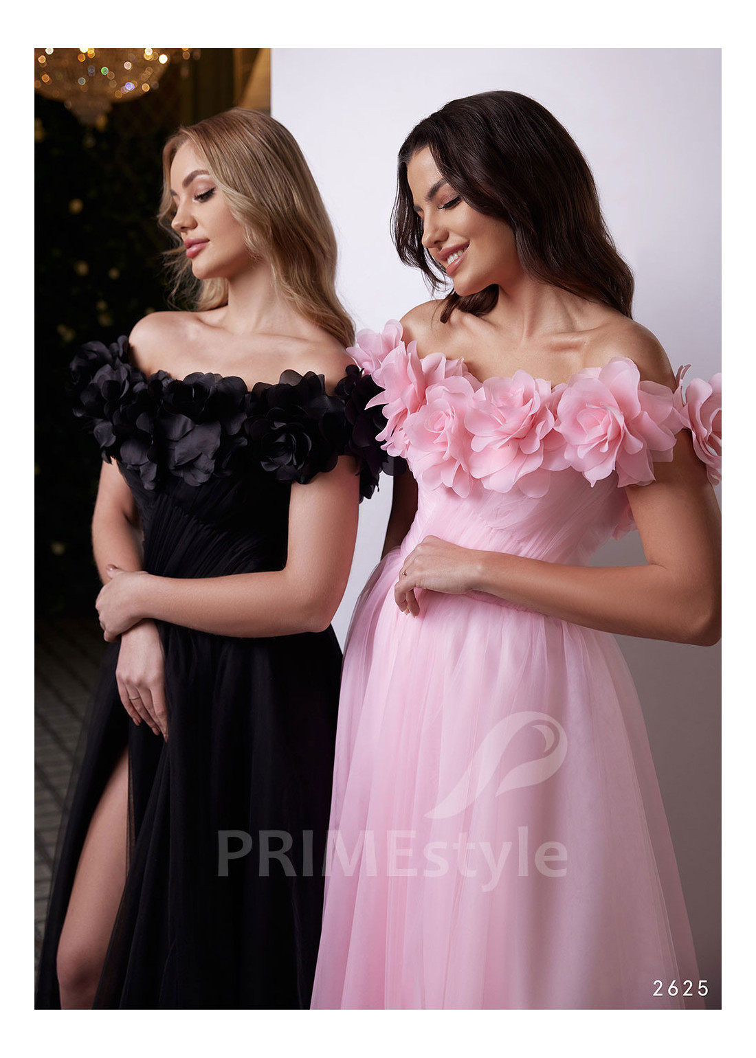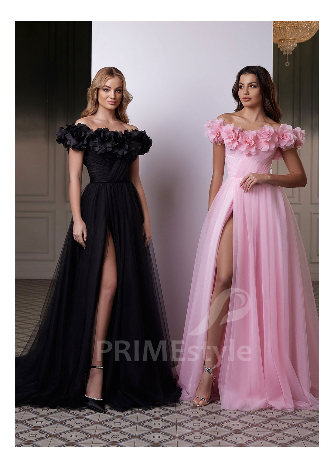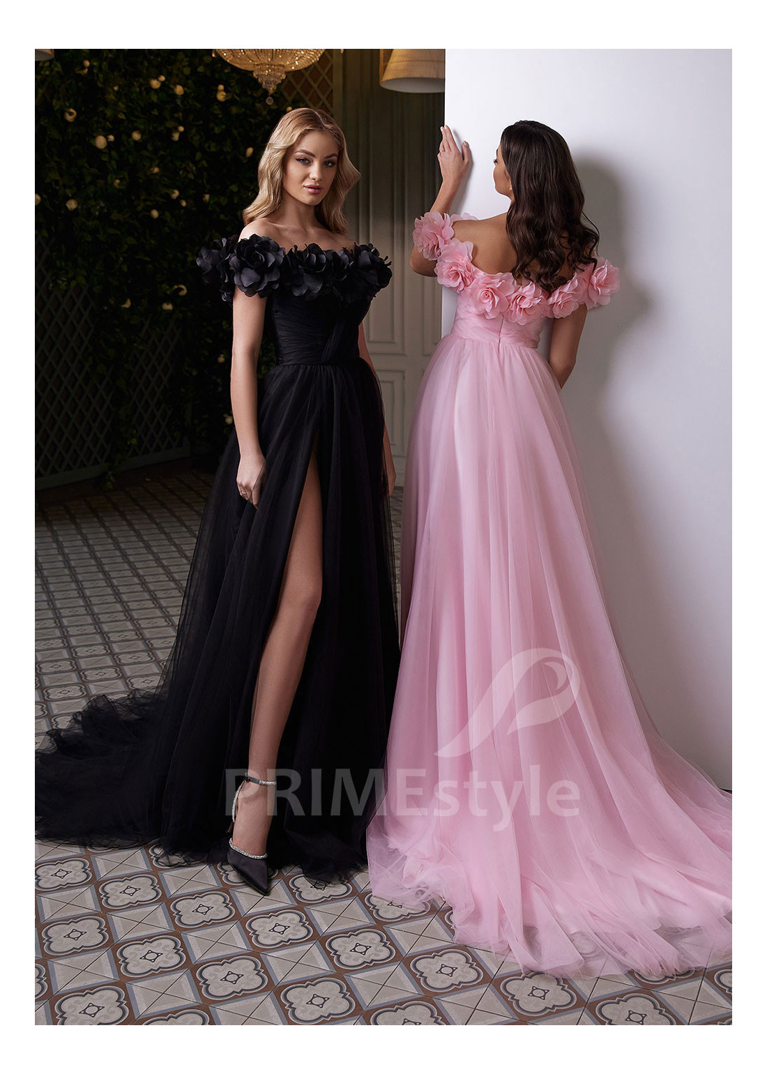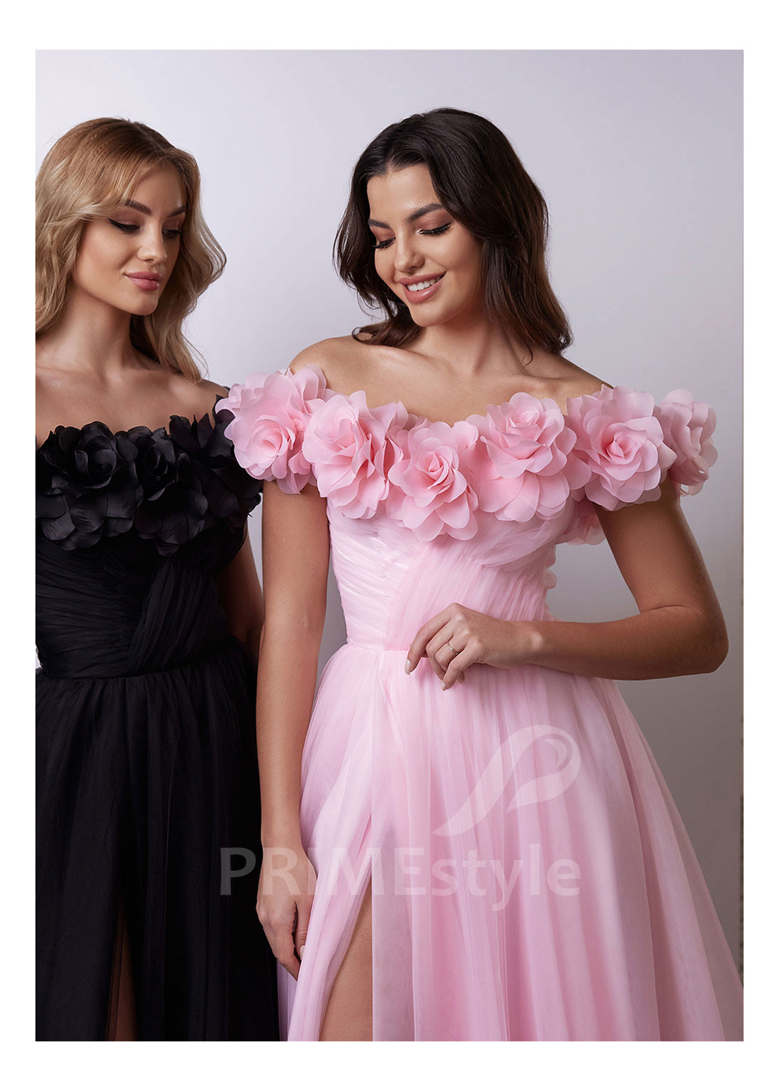 Romantické tylové spoločenské šaty, zdobené veľkými objemnými kvetmi. Vzdušná tylová sukňa s hlbokým rázporkom. Vhodné aj ako šaty na ples alebo popolnočné šaty.