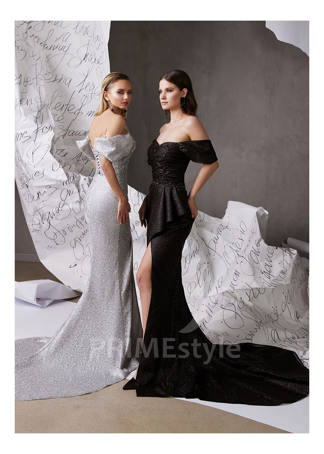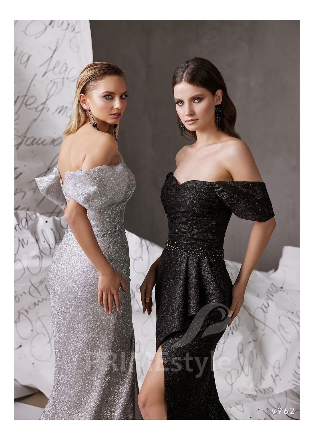 Dlhé luxusné spoločenské šaty s asymertickou zaujímavo tvarovanou sukňou s hlbokým rázporkom, pdnutými ramienkami a odhaleným chrbtom.
