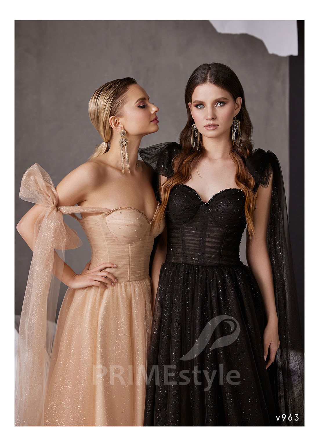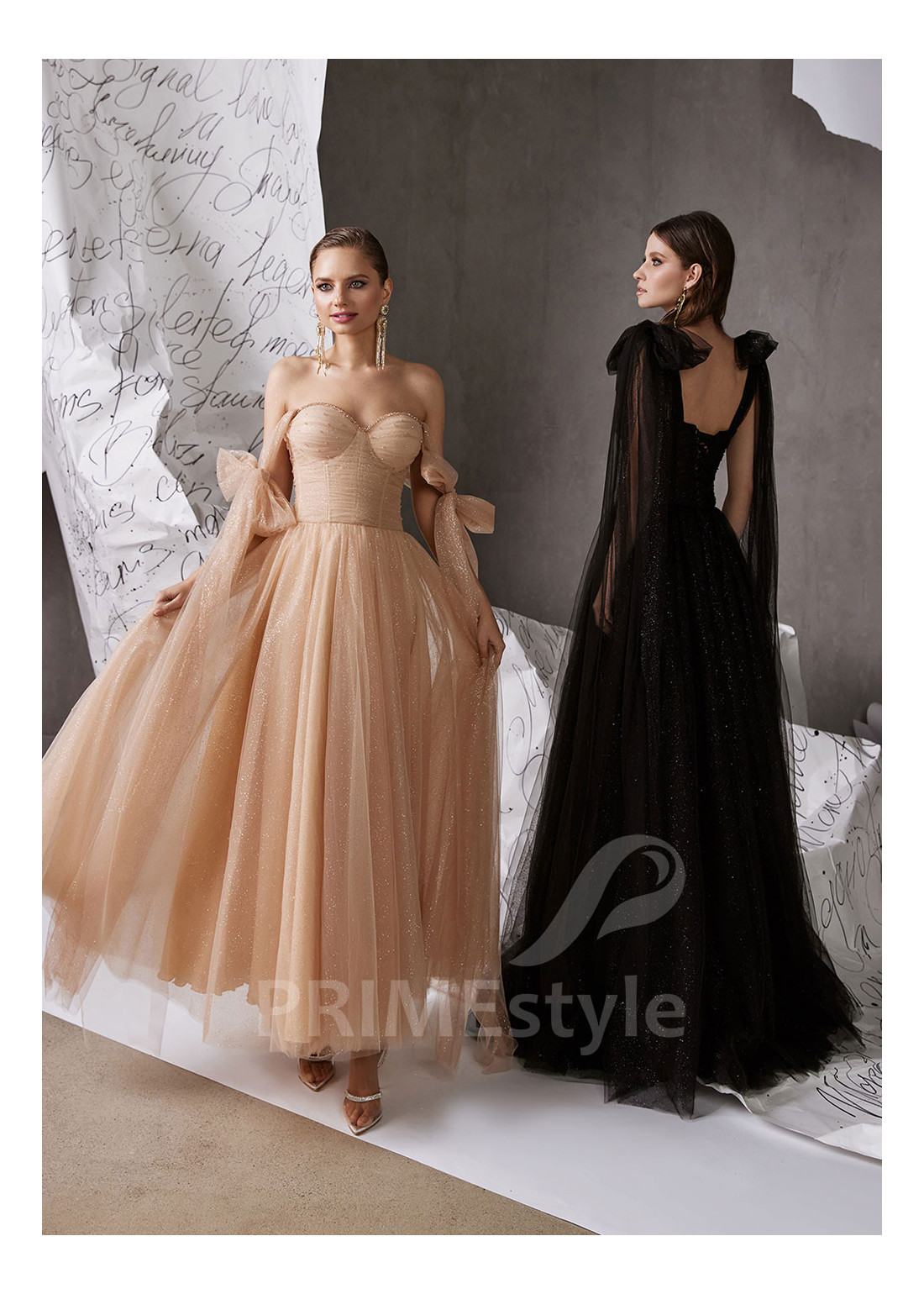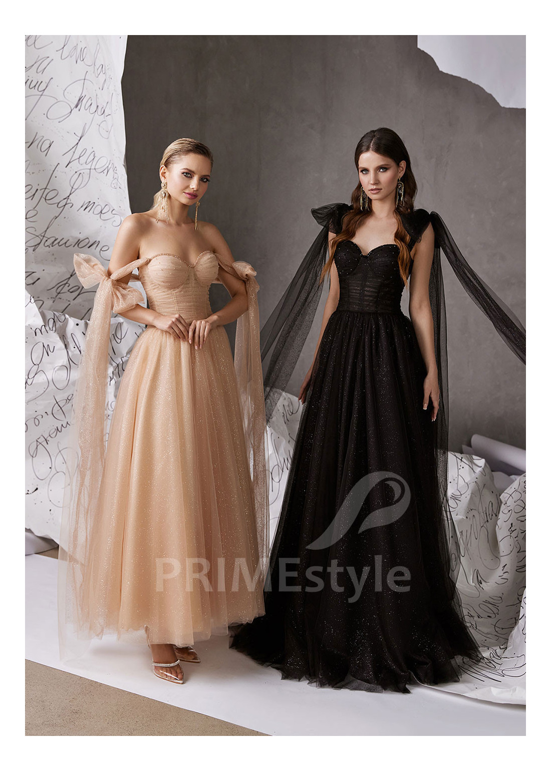 Trblietavé spoločenské šaty na ramienka, zdobené objemnými mašľami. So srdiečkovým výstrihom na hrudi. Možnosť ušitia buď s midi alebo maxi sukňou.