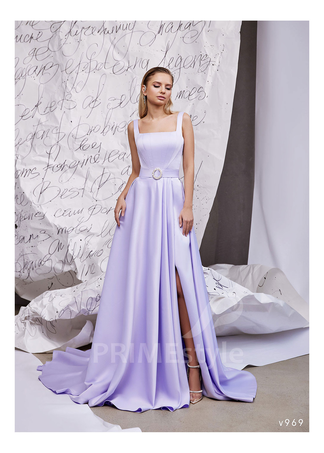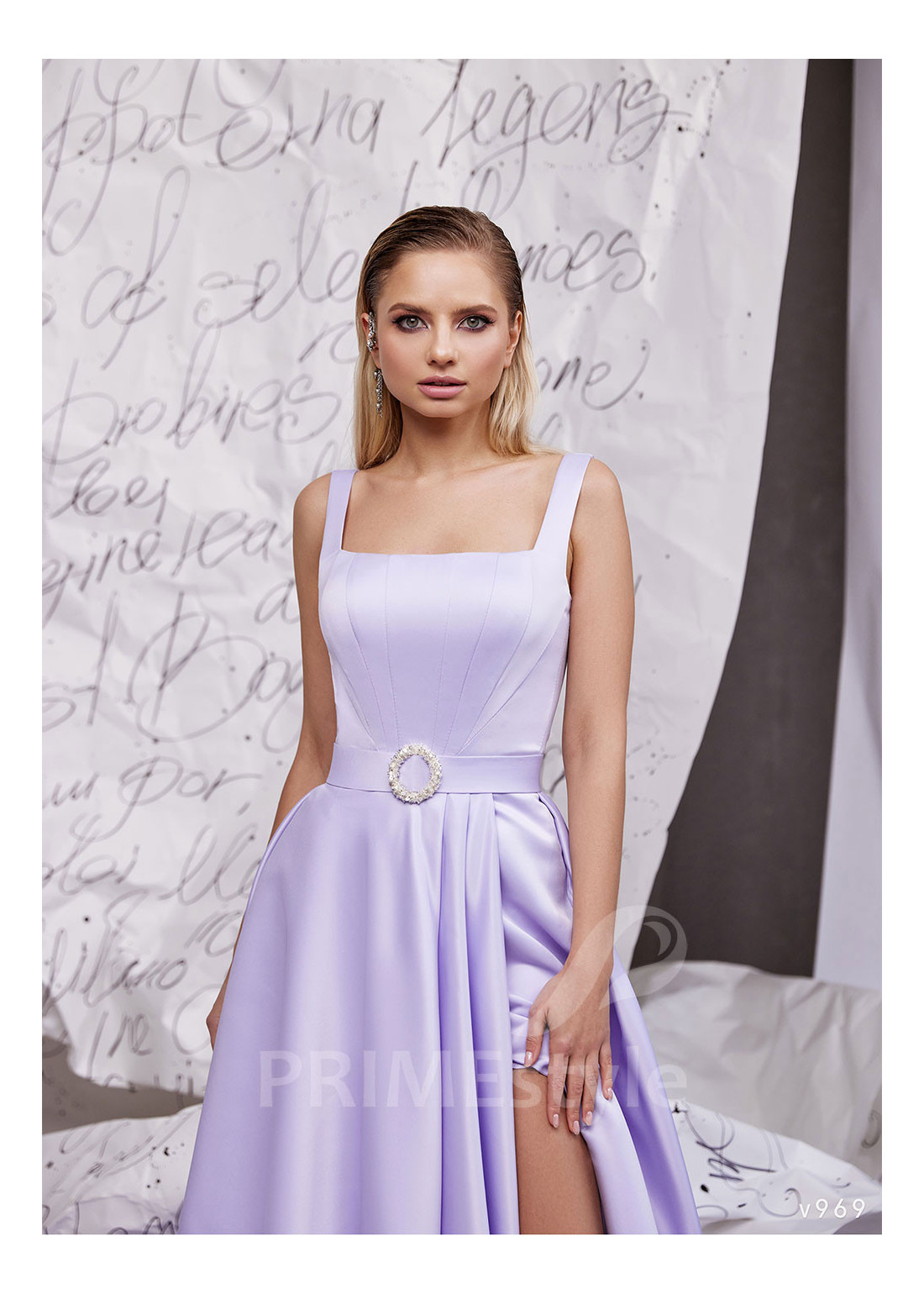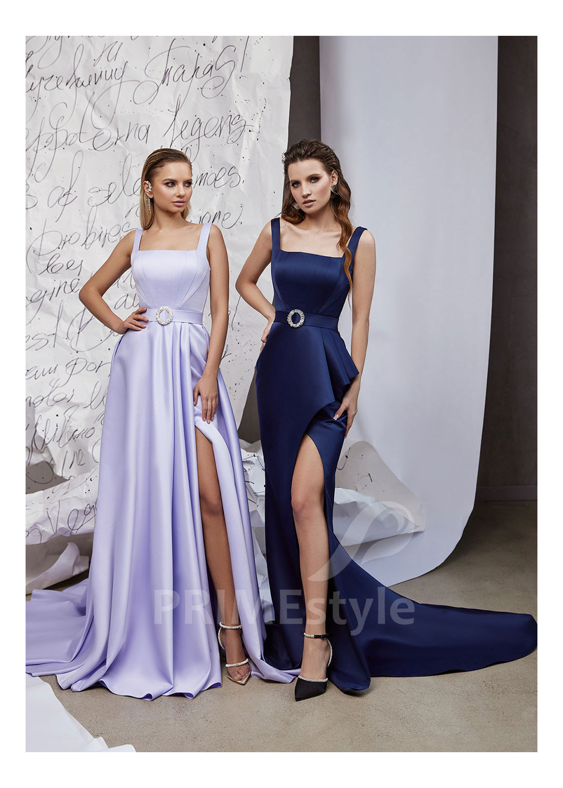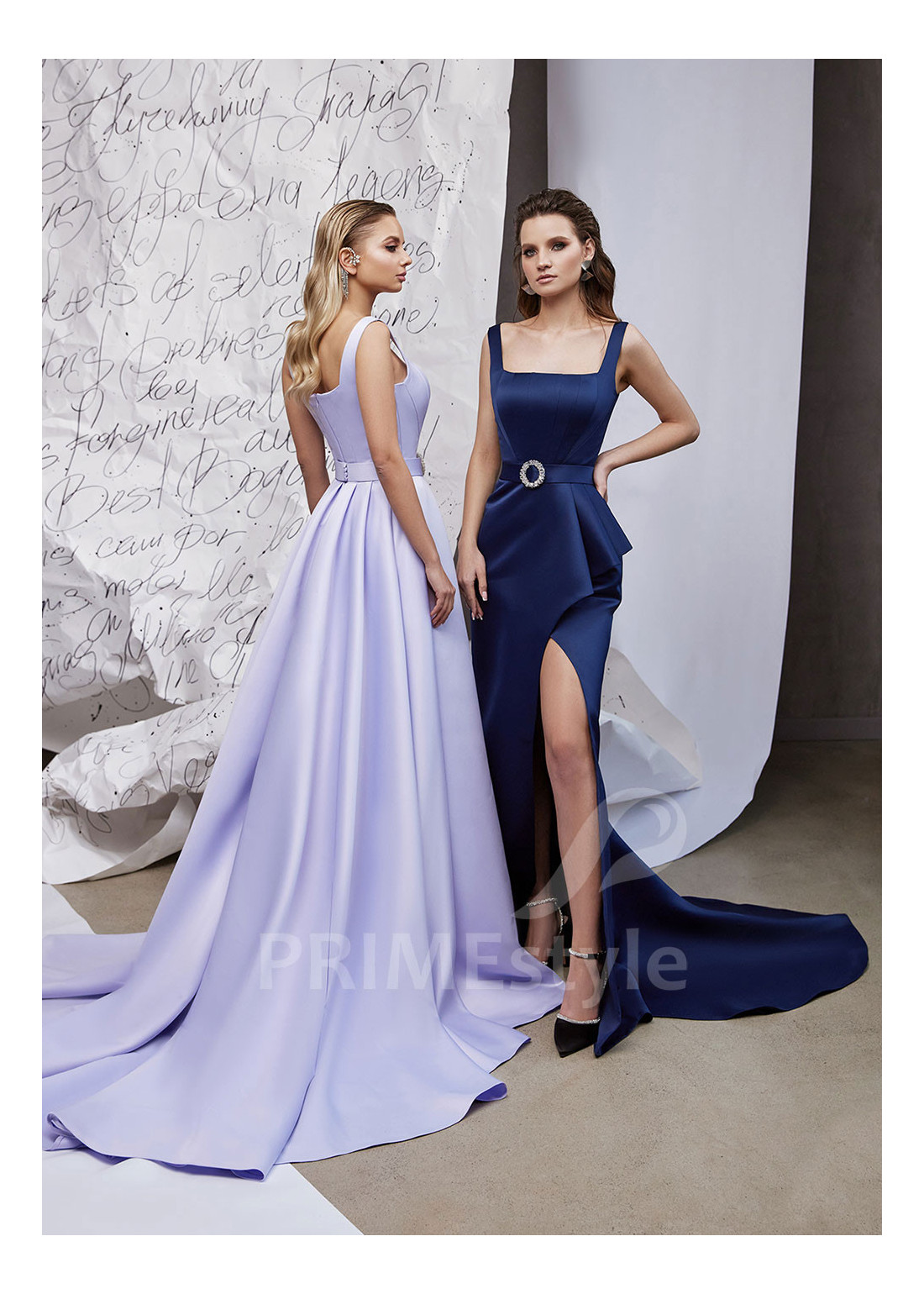 Saténové spoločenské šaty s trendovým štvorcovým výstrihom na hrudí a s elegantnou sukňou s hlbokým rázporkom. Možnosť výberu strihu sukne z dvoch variant. Vhodné aj ako šaty na ples.
