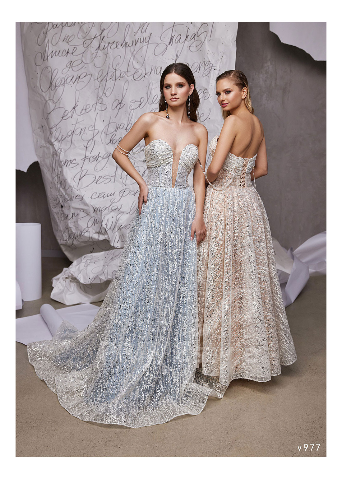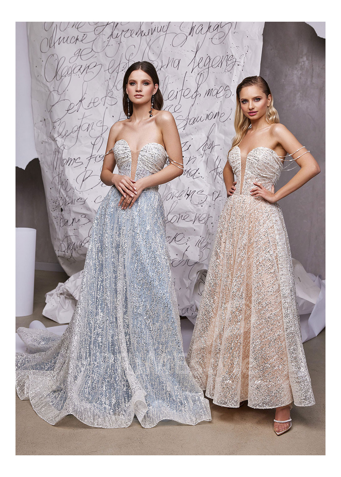 Dlhé luxusné spoločenské šaty s tenkými padnutými ramienkami, s hlbokým V výstrihom na hrudi a odhaleným chrbtom. Možnosť ušitia buď s midi alebo maxi sukňou. Vhodné aj ako šaty na ples alebo šaty na stužkovú slávnosť.