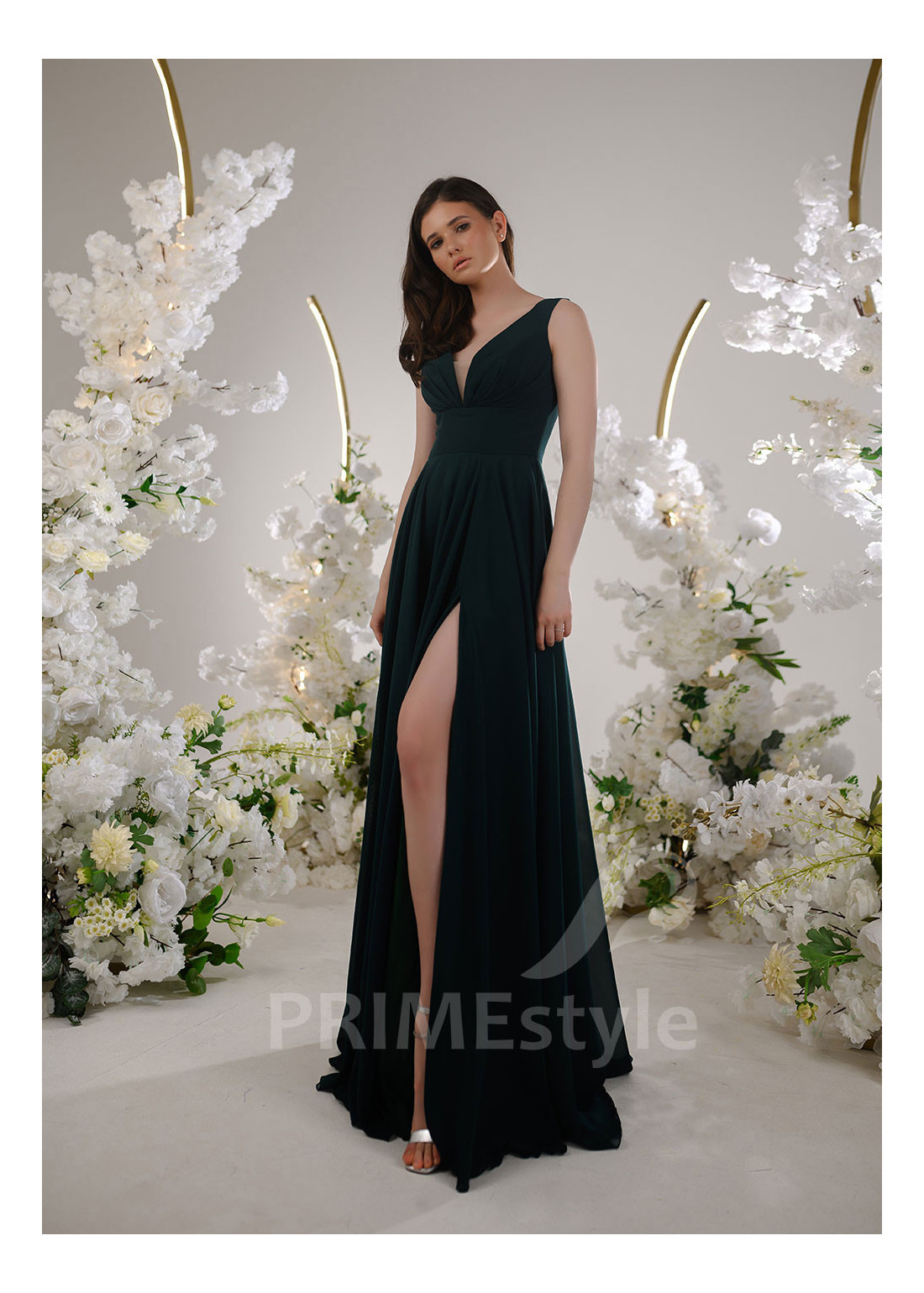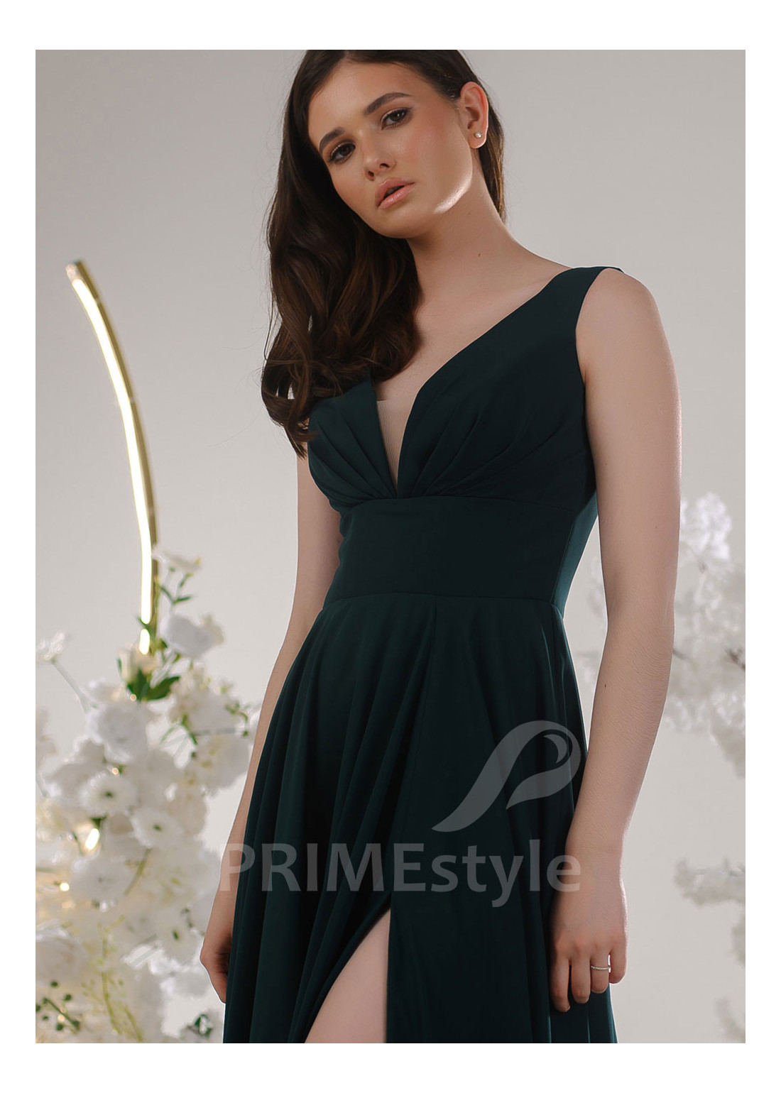 Elegantné spoločenské šaty s decentným V výstrihom na hrudi, zvýrazneným pásom a pekne tvarovanou padavou sukňou s rázporkom na ľavej nohe. Vhodné aj ako šaty na stužkovú, šaty na ples alebo šaty pre svadobné mamy.