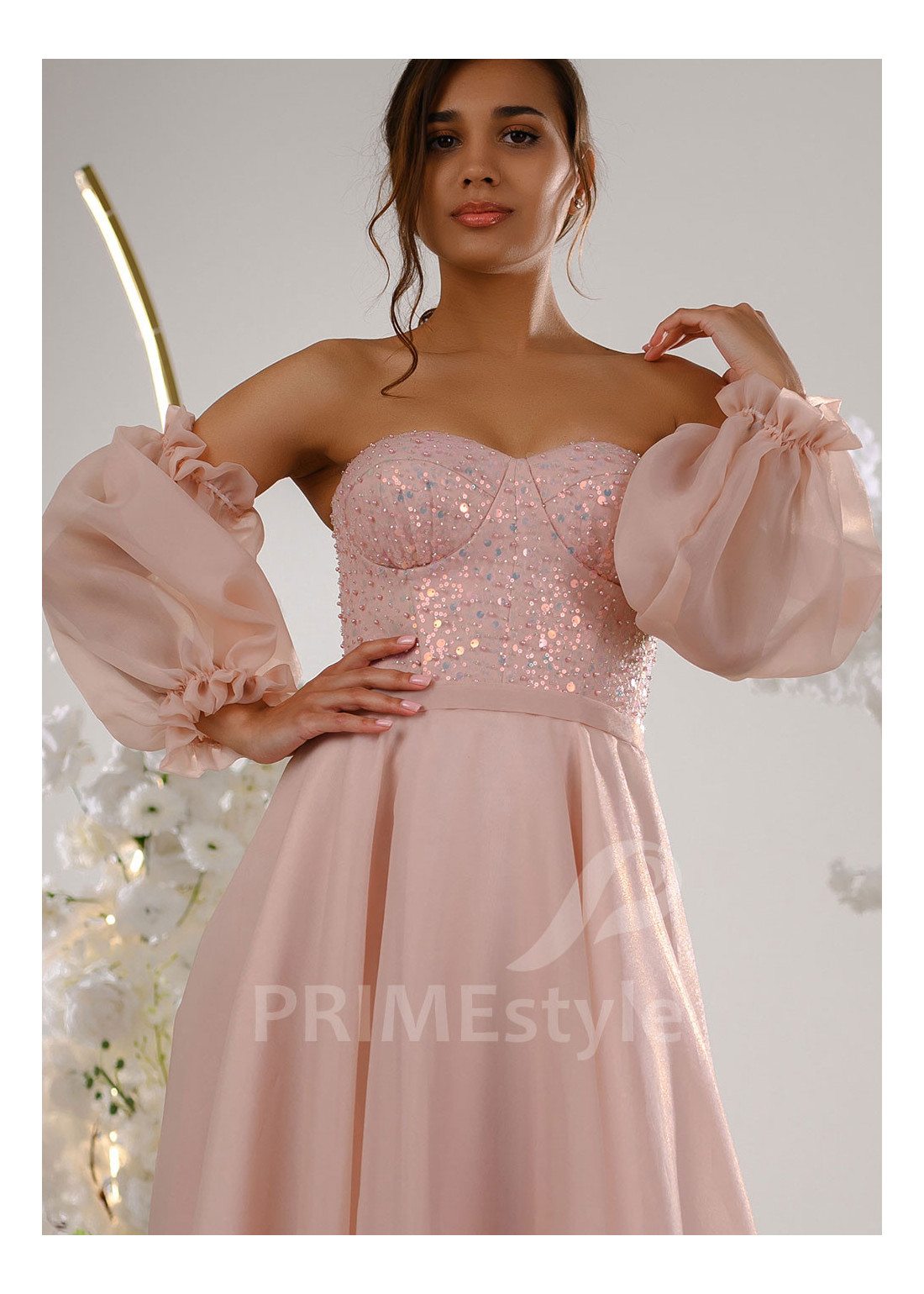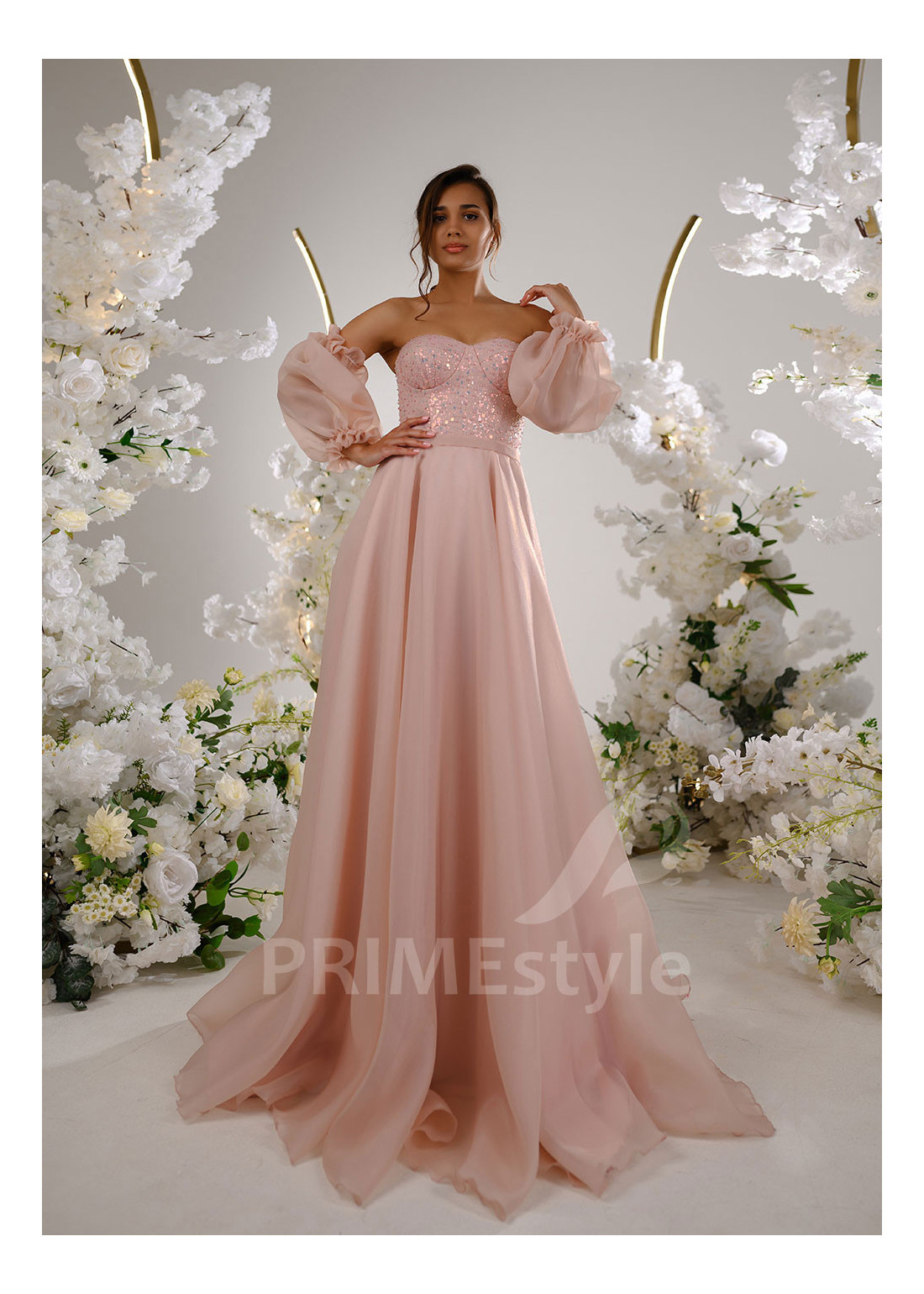 Slávnostné spoločenské šaty so srdiečkovým výstrihom na hrudi, samostatnými balónovými kukávmi a objemnou padavou sukňou. Vhodné aj ako šaty na ples, šaty na stužkovú alebo šaty pre svadobné mamy.