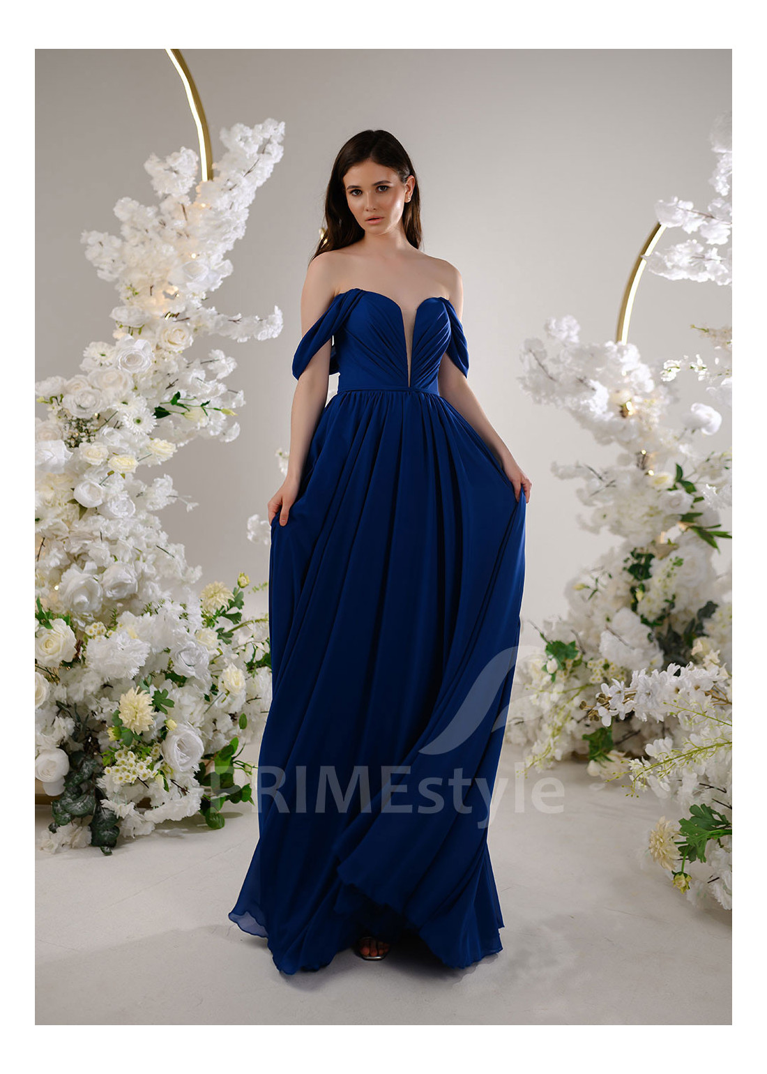 Dámske spoločenské šaty s decentným V výstrihom na hrudi, padnutými ramienkami a objemnou padavou sukňou. Vhodné aj ako šaty na ples alebo šaty pre svadobné mamy.