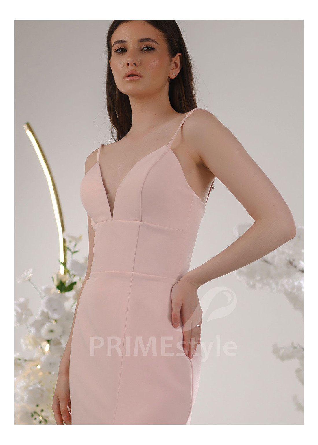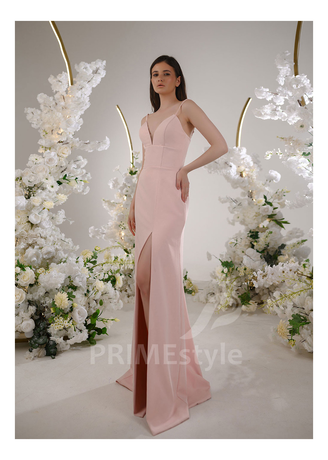 Decentné spoločenské šaty na ramienka s V výstrihom na hrudi, zvyrazneným pásom a rovnou sukňou s výstrihom na ľavej nohe. Vhodné ako šaty na svadbu, šaty pre družičky alebo šaty na stužkovú slávnosť.