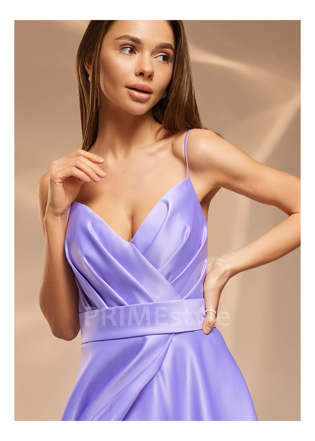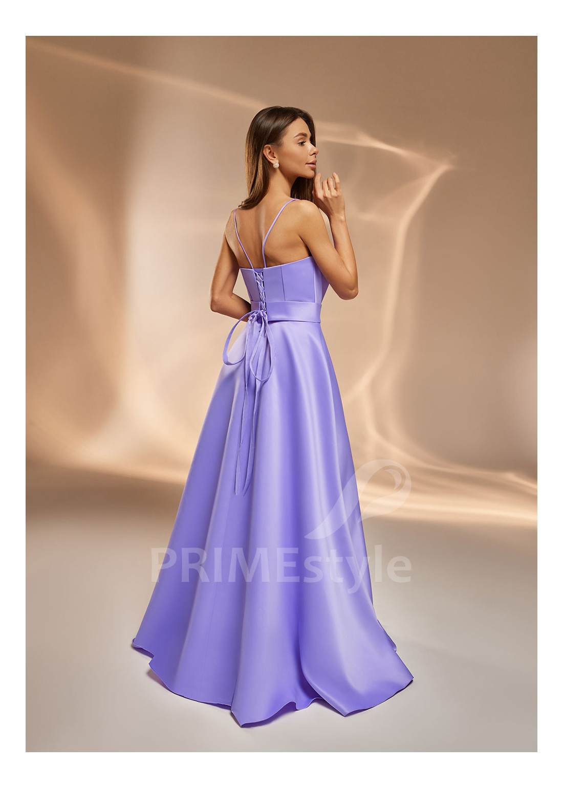 Decentné spoločenské šaty na ramienka s V výstrihom na hrudi, mierne odhaleným chrbtom a s pekne tvarovanou padavou sukňou s rázporkom na pravej nohe. Vhodné aj ako popolnočné šaty.