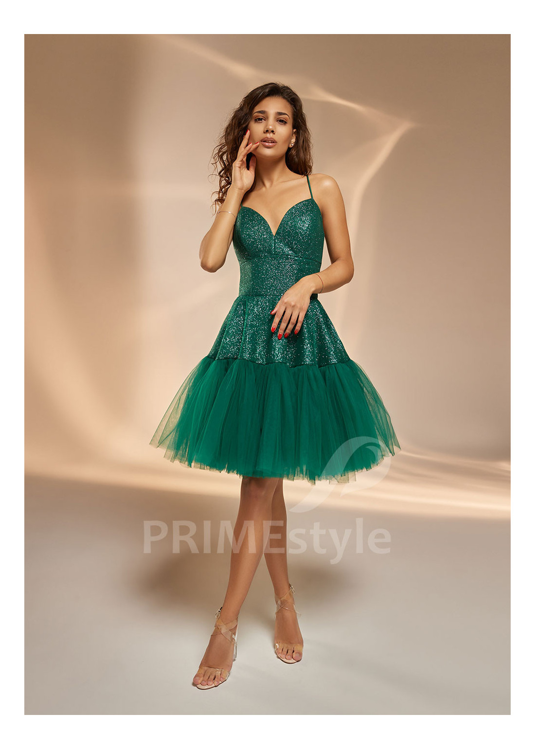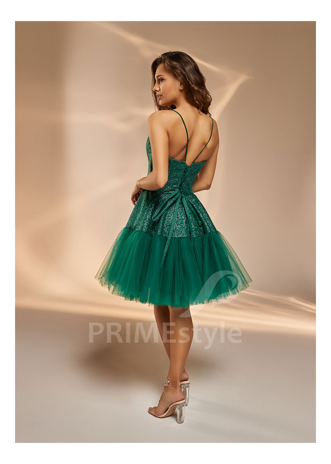 Krátke spoločenské šaty na tenké ramienka so srdiečkovým výstrihom na hrudi a mierne odhaleným chrbtom. Krátka sukňa je ukončena rozkošným volánom. Vhodné aj ako šaty pre družičky, šaty na svadbu alebo popolnočné šaty.