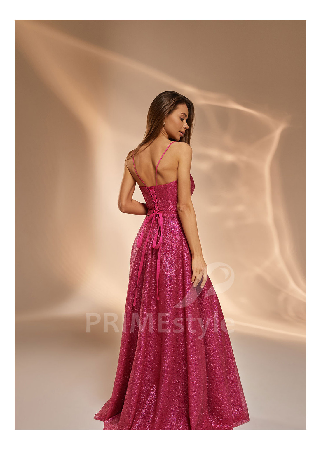 Dlhé luxusné spoločenské šaty na ramienka so srdiečkovým výstrihom na hrudi. Vyhotovené z trblietavej látky. Sukňa s hlbokým rázporkom na pravej nohe. Vhodné aj ako šaty na ples alebo šaty pre svadobné mamy.
