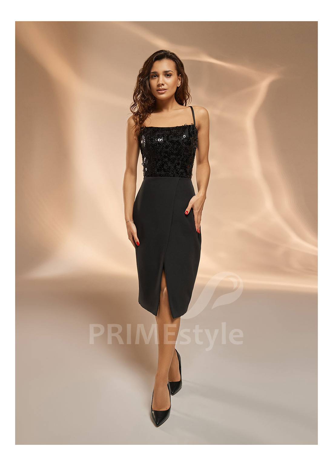 Krátke spoločenské šaty s trendovým rovným výstrihom na hrudi. S trblietavým korzetom a elegantnou sukňou s výstrihom na ľavej nohe. Vhodné ako koktejlové šaty alebo šaty na promócie.