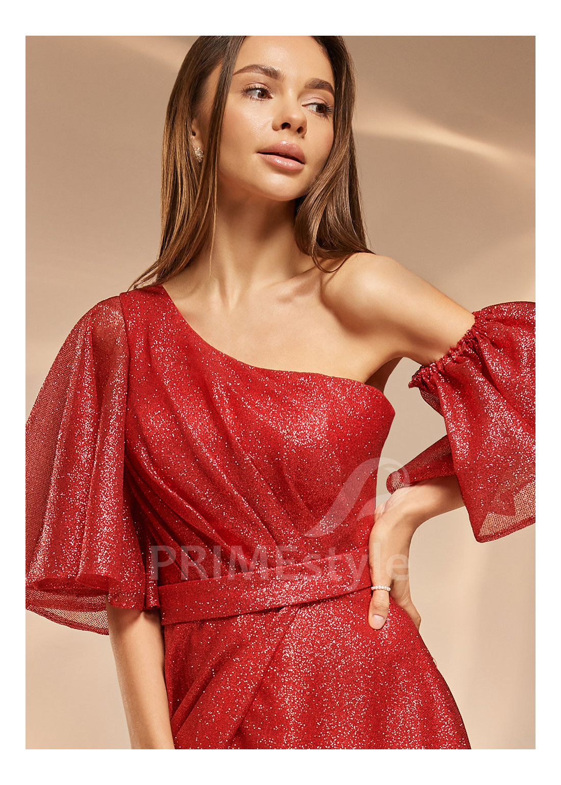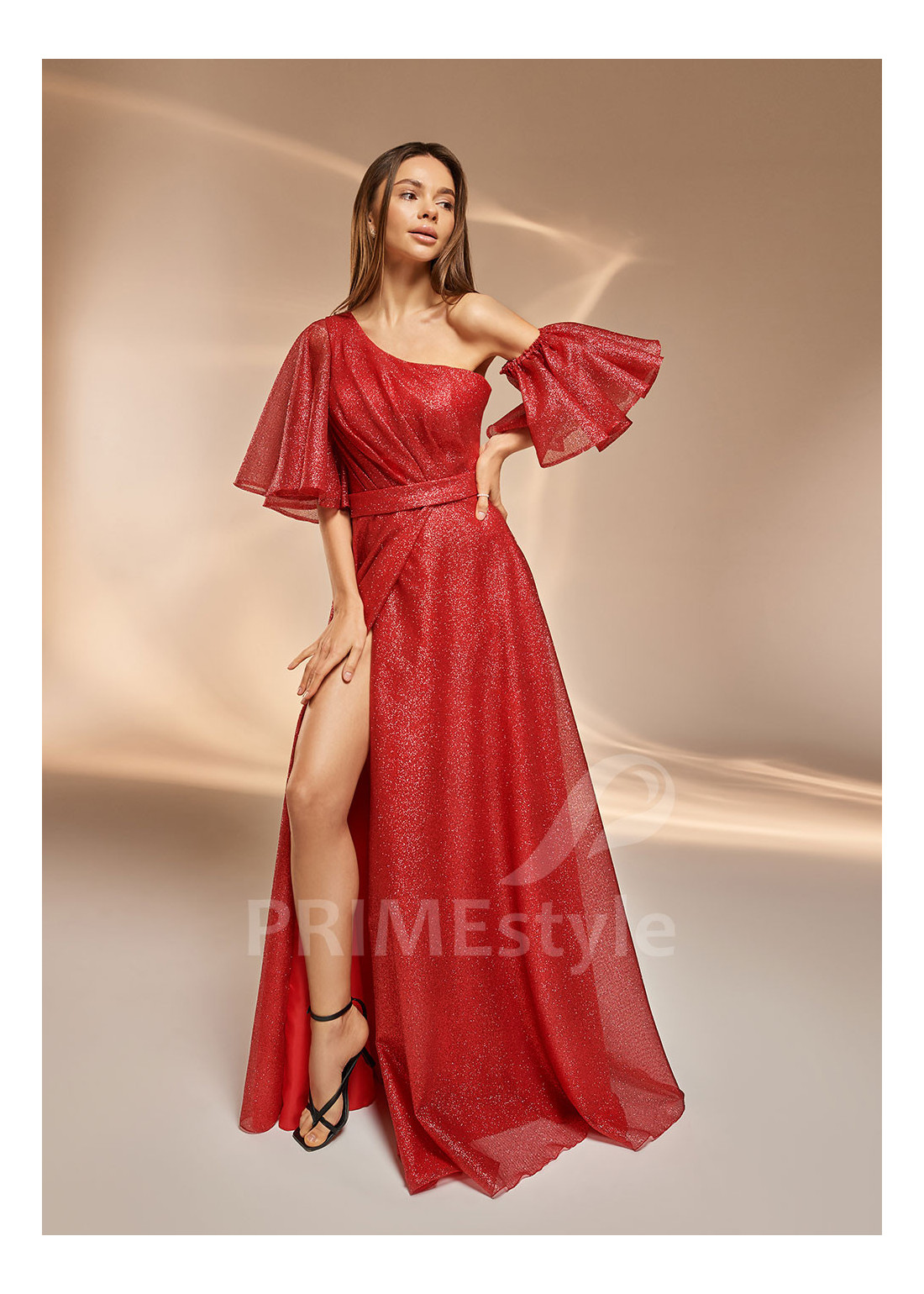 Dlhé luxusné spoločenské šaty asymetrického strihu. S objemnými voľne padajucimi rukávmi a s padavou pekne tvarovanou sukňou s rázporkom na pravej nohe.