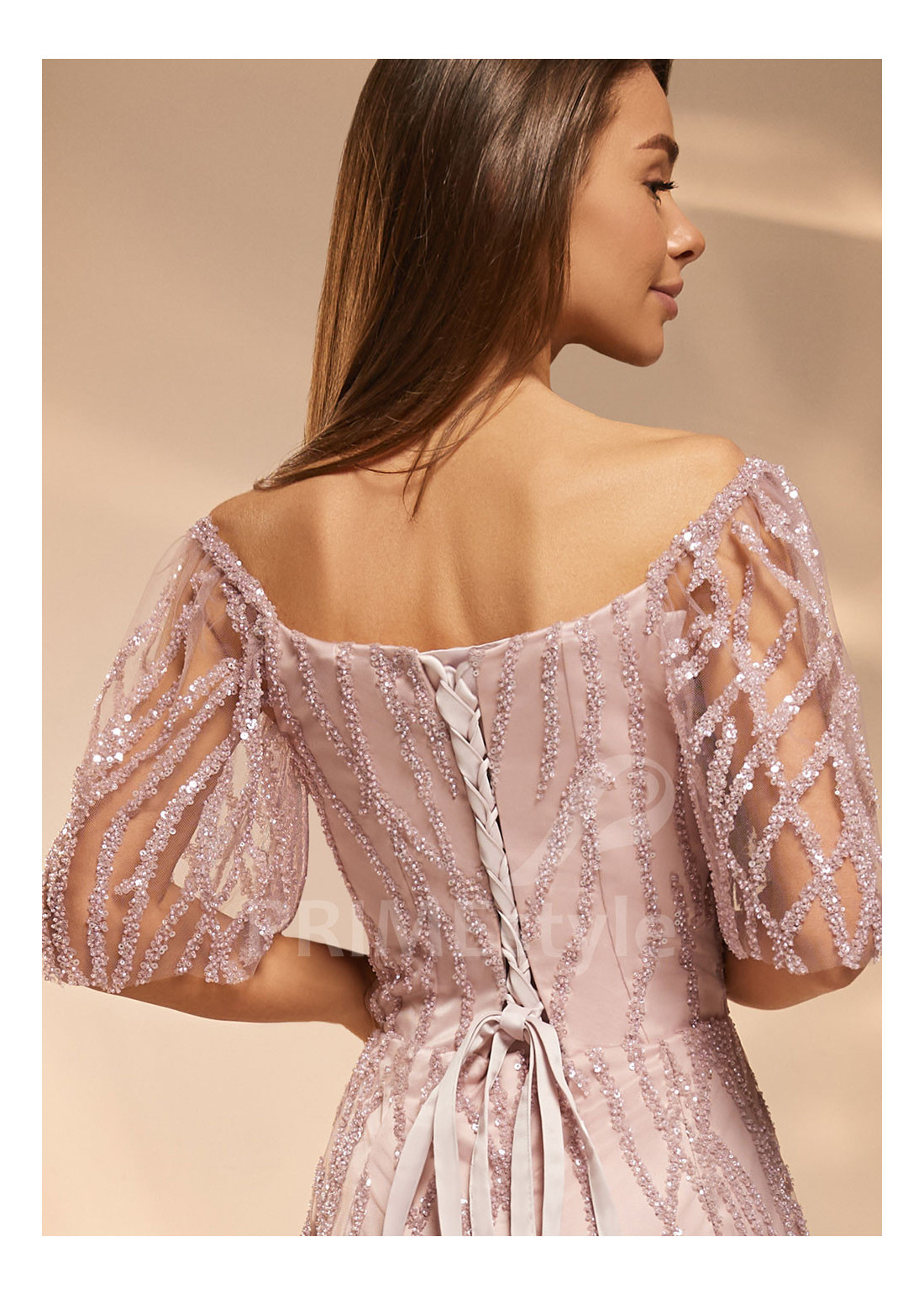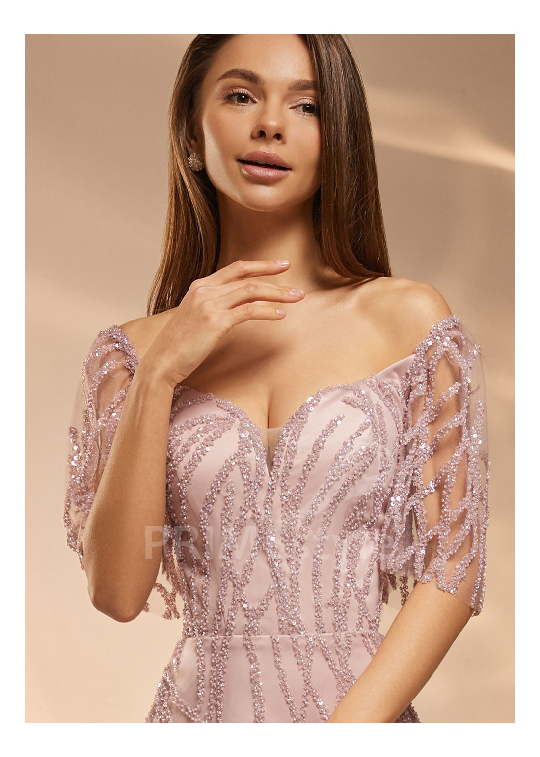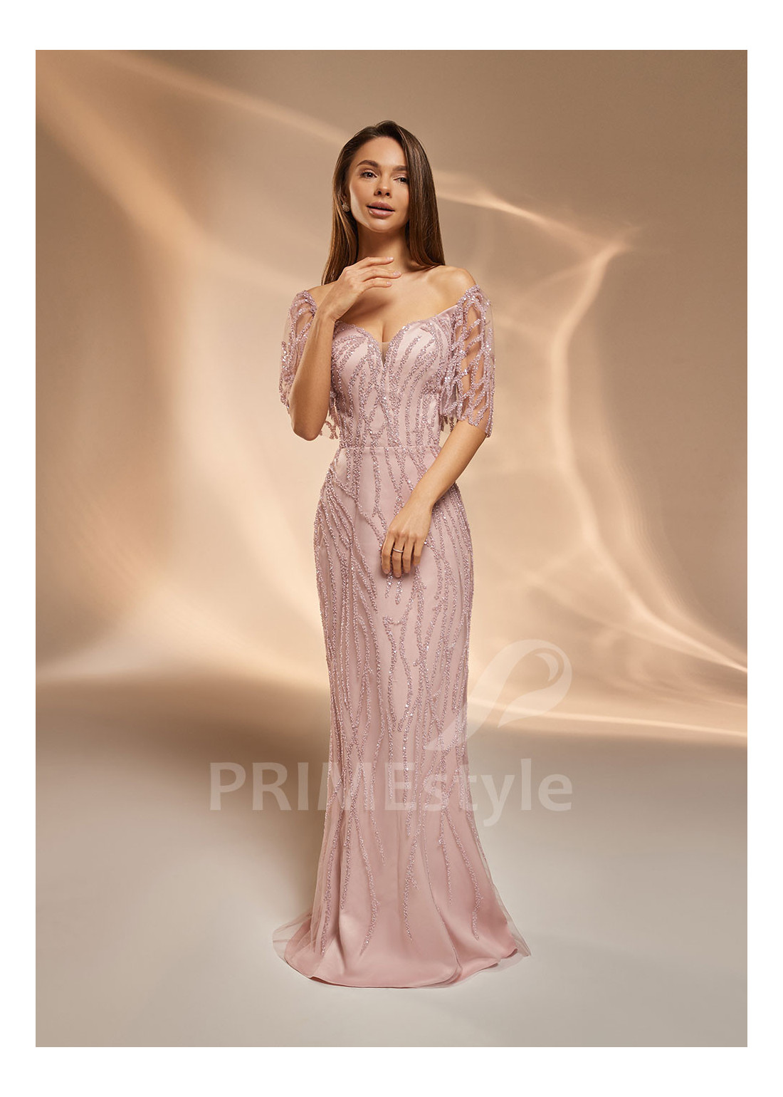 Dlhé luxusné spoločenské šaty s krátkymi rukávmi, decentným V výstrihom na hrudi a zakrytým chrbtom. Zdobené bohatou čipkou, vyšívanou flitrami a perličkami. Vhodné aj ako luxusné šaty na stužkovú alebo šaty pre svadobné mamy.