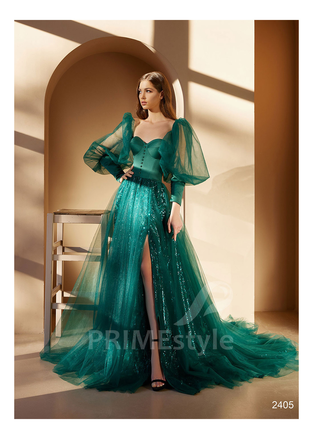 Slávnostné spoločenské šaty s trendovým srdiečkovým korzetom, objemnými balónovými rukávmi a ľahkou trblietavou tylovou sukňou s rázporkom na ľavej nohe. Vhodné aj ako šaty na ples alebo šaty pre svadobné mamy.