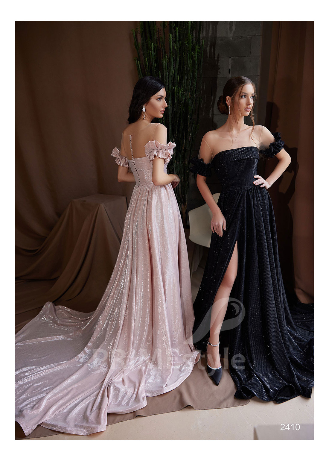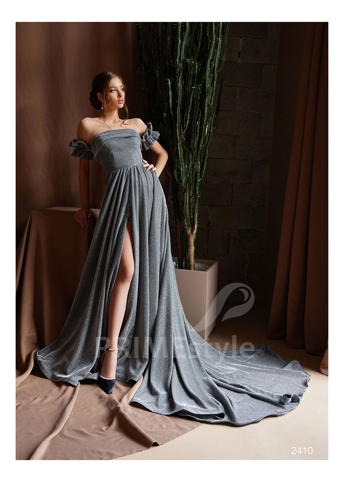 Dlhé luxusné trblietavé spoločenské šaty s volánovými rukávmi a krásne tvarovanou padavou sukňou s rázporkom na pravej nohe. Vhodné ako šaty na ples, šaty na stužkovú alebo šaty pre svadobné mamy.