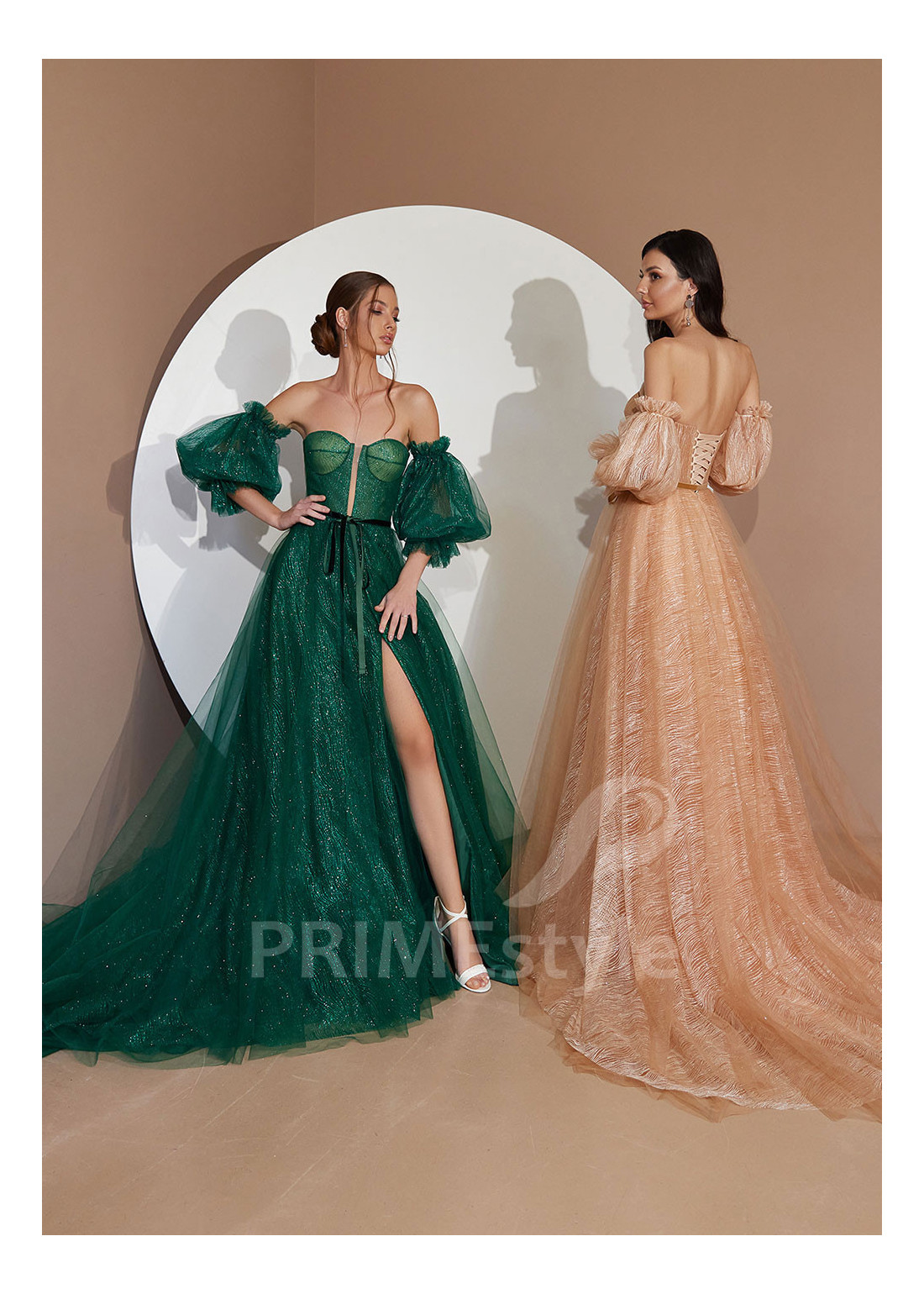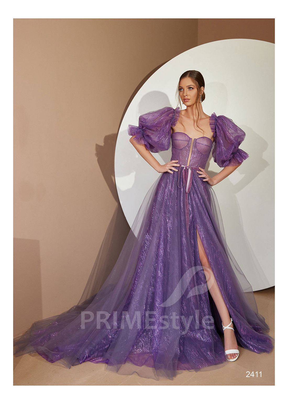 Moderné trblietavé spoločenské šaty s otvoreným dekoltom a so samostatnými balónovými rukávmi. Sukňa s hlbokým rázporkom na ľavej nohe. Vhodné aj ako šaty na ples.
