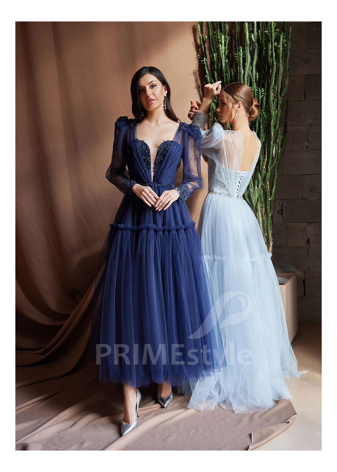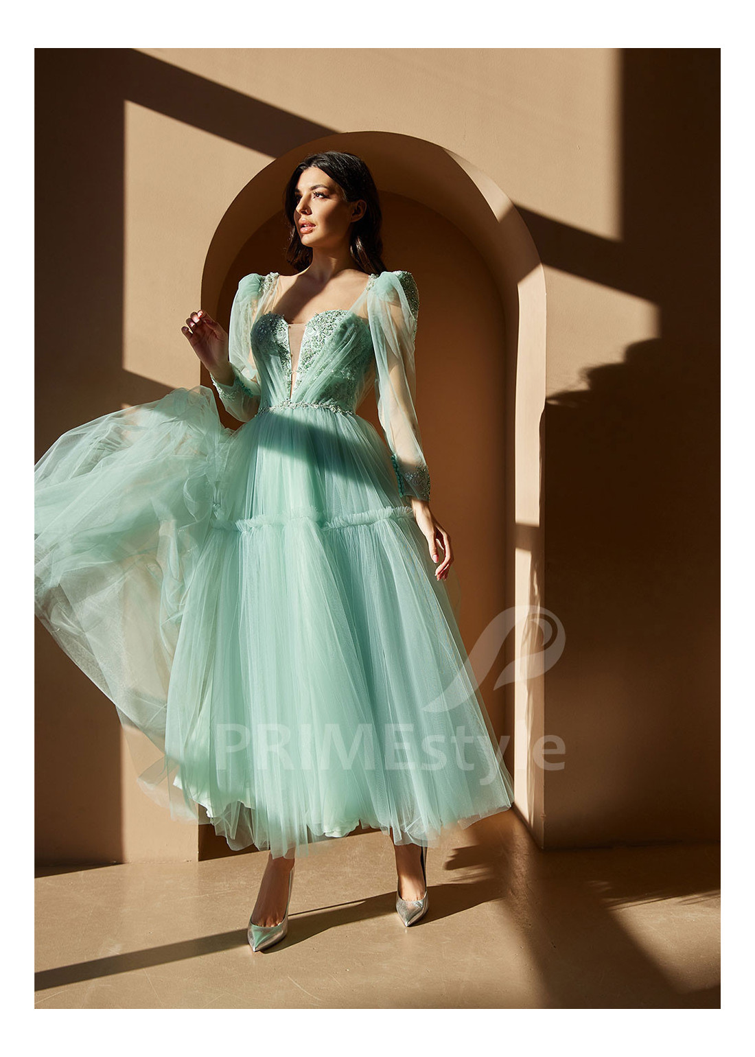 Midi spoločenské šaty s hlbokým V-výstrihom na hrudi, mierne odhaleným chrbtom a objemnými balónovými rukávmi. S ľahkou tylovou sukňou s volánom na spodnom okraji. Možnosť ušitia s midi alebo maxi sukňou.