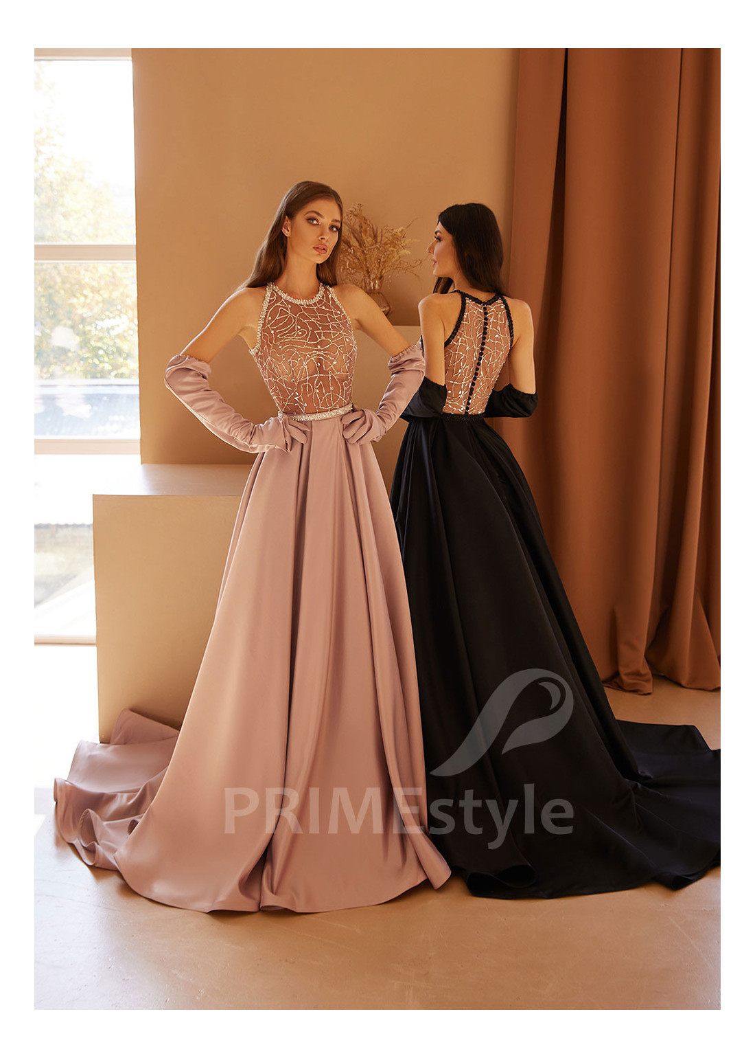 Moderné spoločenské šaty s priesvitným bohato zdobeným korzetom, so samostatnými rukávmi a s elegantnou padavou sukňou. Vhodné ako šaty na ples, šaty na stužkovú, šaty na svadbu alebo šaty pre svadobné mamy.